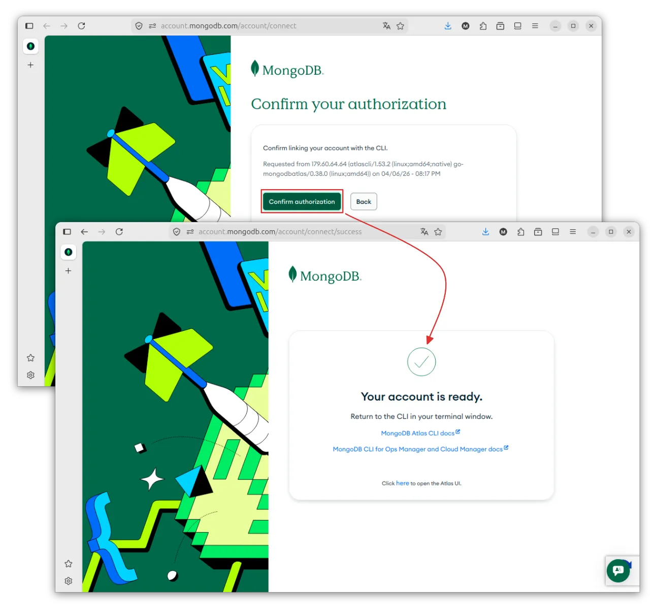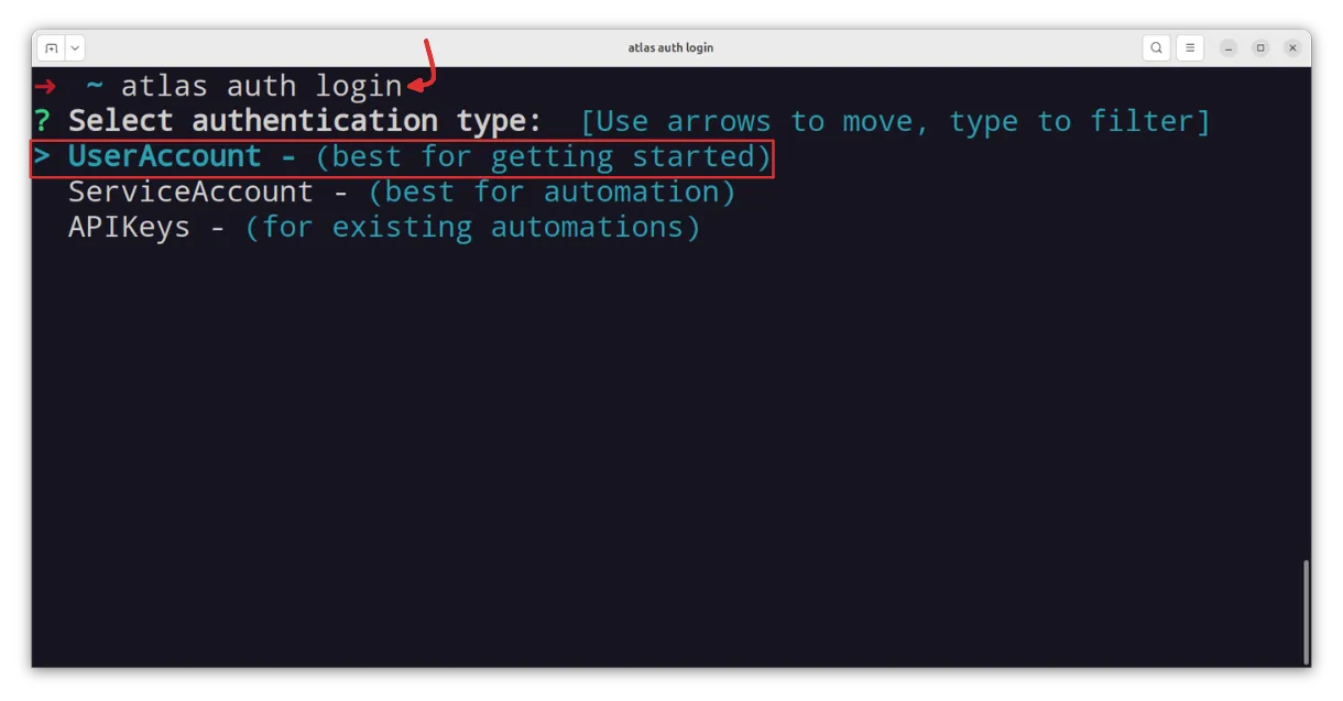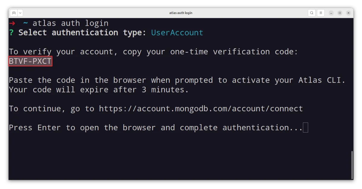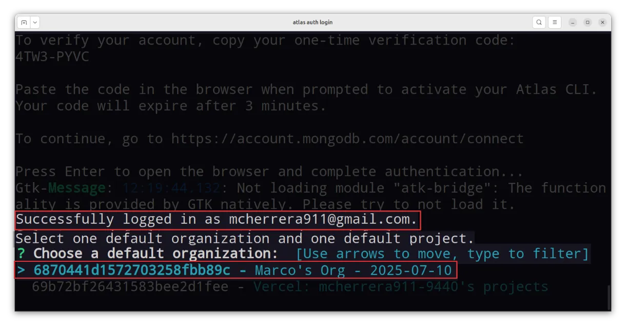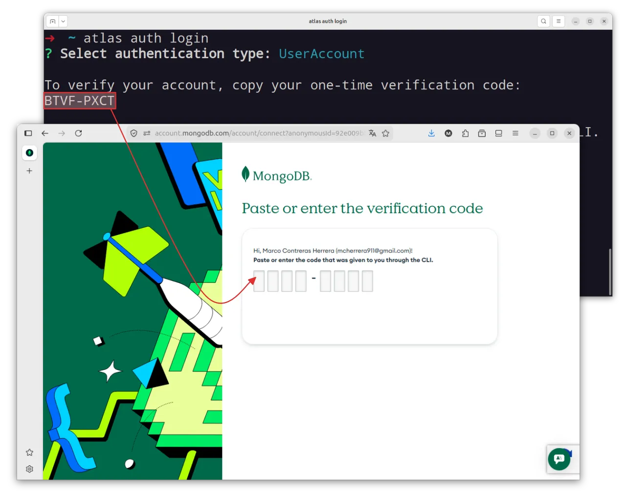 Ya tienes instalado Atlas CLI y logueado con tu cuenta de MongoDB Atlas.