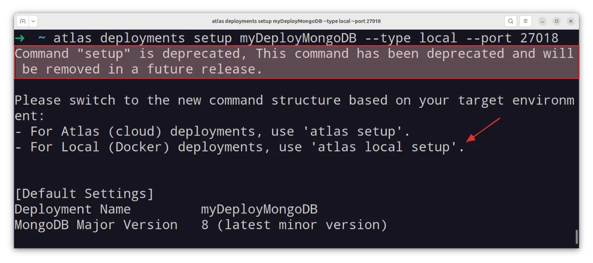 Desde la versión 1.25.0 de Atlas CLI, la forma de configurar entornos locales cambió. Por eso, al usar comandos antiguos (aunque todavía funcionan), pueden aparecer advertencias de deprecación.