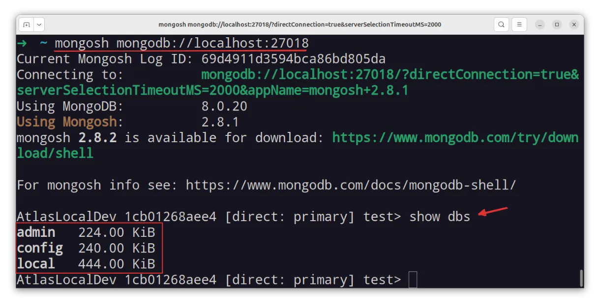 mongodutilizando el puerto predeterminado (27017), por lo que se especificó el puerto27018. En caso de no indicar esta opción, el sistema intentará usar el puerto por defecto. De igual forma, si no se proporciona un nombre para el deployment, el CLI asignará uno automáticamente.
