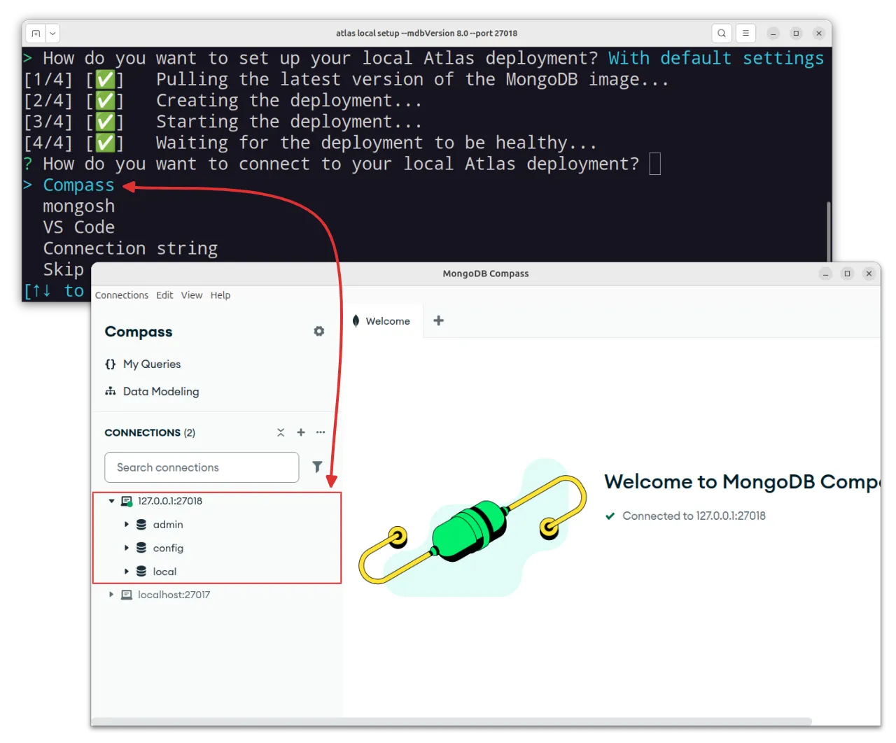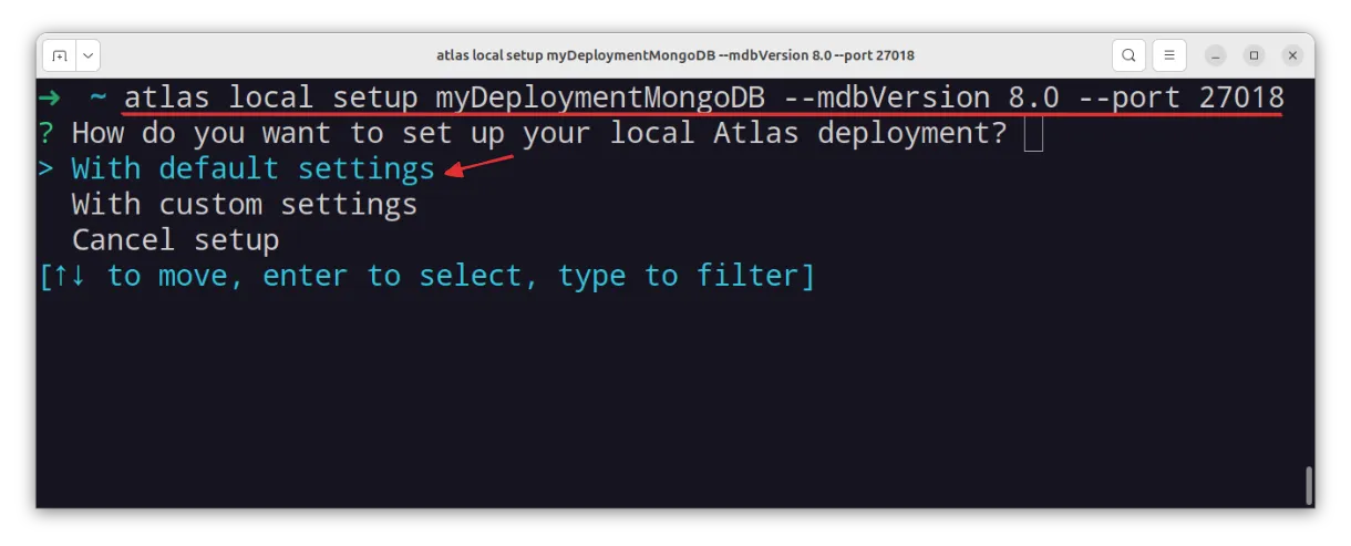 atlas local setup myDeploymentMongoDB --mdbVersion 8.0 --port 27018
