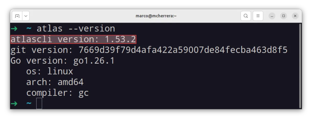 Ahora vamos a levantar una implementación local de MongoDB y es un procedimiento bastante simple. Primero revisa la versión de Atlas CLI: