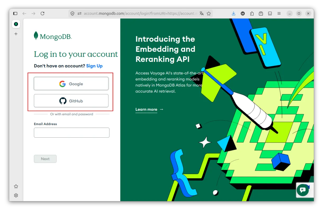 Luego, ingresa tu correo que registraste la cuenta en Atlas o selecciona el proveedor (recomendado usar Google o GitHub):