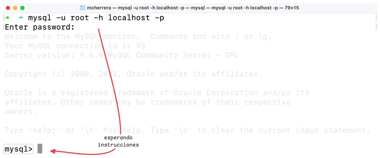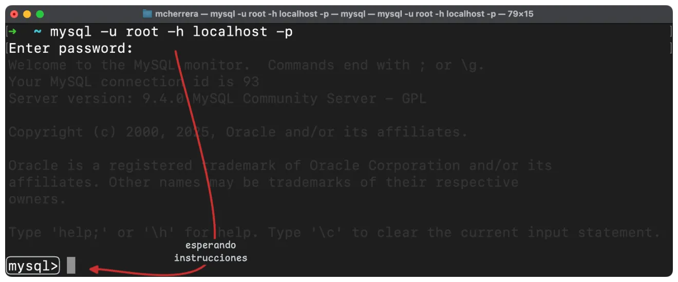 Cuando la conexión se realiza correctamente, MySQL muestra un mensaje de bienvenida y cambia el prompt de la consola, indicando que estamos en una sesión activa y listos para ejecutar comandos SQL.