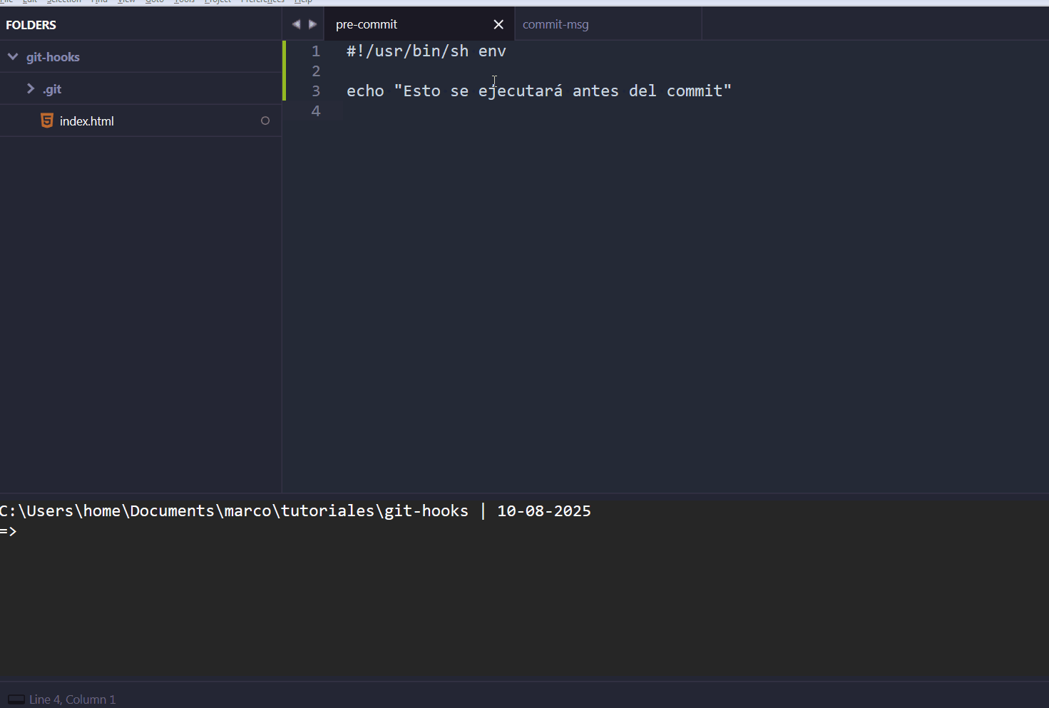 Git utiliza estos scripts automáticamente en función de los eventos correspondientes. Observa la siguiente demostración:
