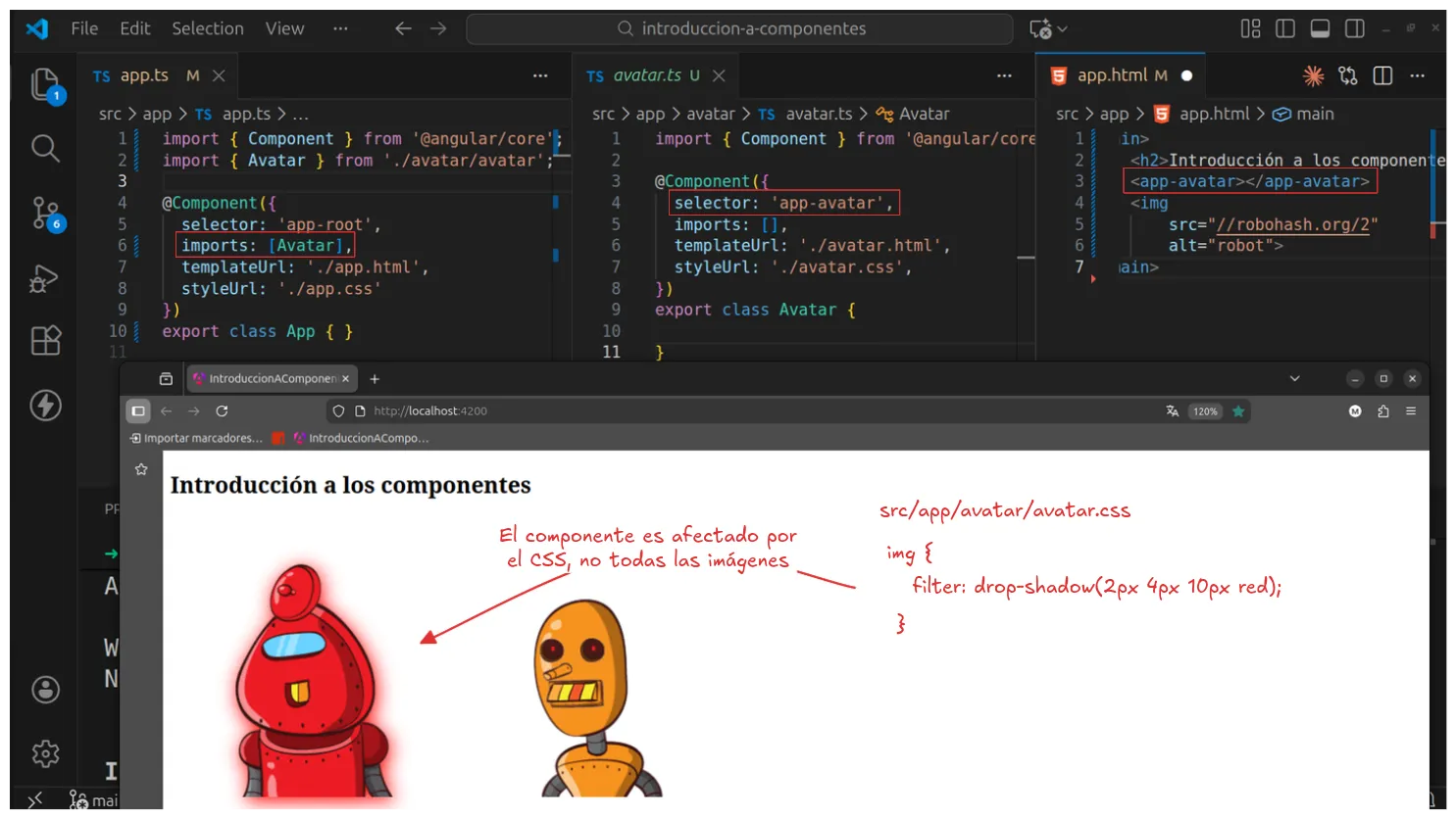 Ahora que ya está importado, se puede usar en el template llamando a su selector. Por ejemplo, tenemos algo como esto: