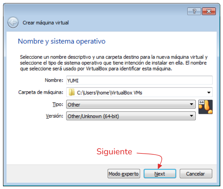 En el siguiente paso, colocamos el nombre a la máquina y llenamos con los valores que se muestran a continuación: