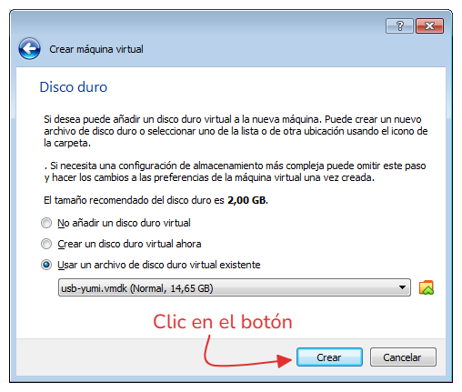 Ahora falta crear el disco de arranque para poder iniciar YUMI, debemos seleccionar Usar un archivo de disco duro virtual existente y buscarlo:
