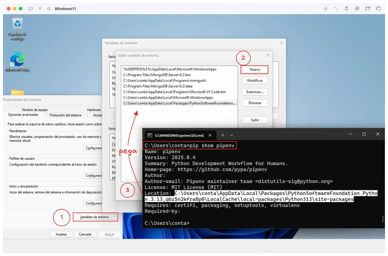 pipenvNO es reconocido, significa que debes añadir su ubicación alPATH. A continuación, la ilustración muestra cómo buscar la ubicación depipenvy cómo agregar esa ruta alPATH. Cuando pegues la ruta, asegúrate de cambiar la última parte (por ejemplo,site-packages) porScripts, que es donde se encuentra el ejecutable.