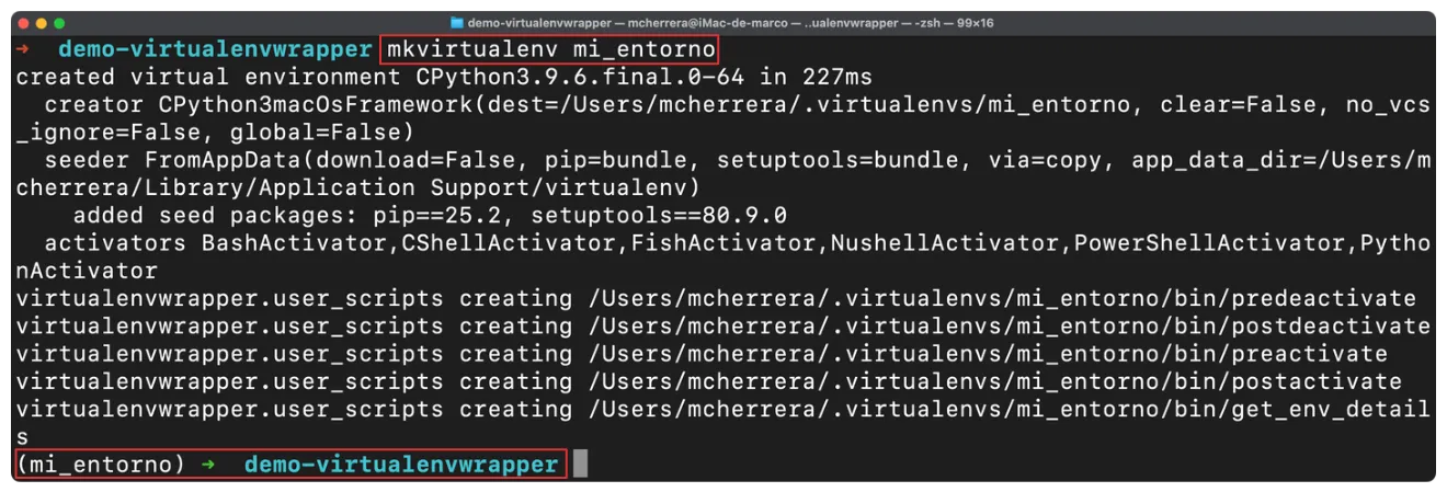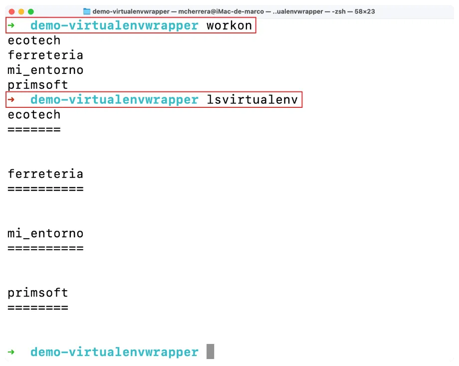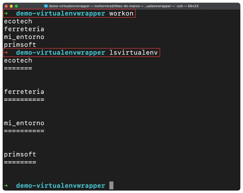En caso de que tengas que volver a activar el entorno, usa el comando workon y el nombre del entorno: