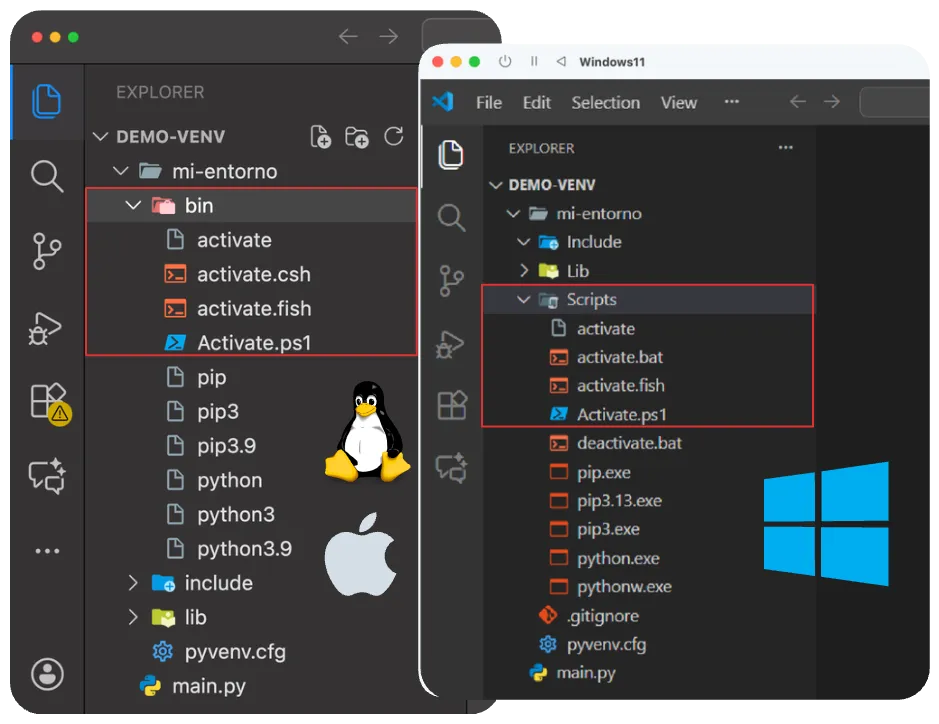 <nombre-entorno>/bin/en Linux y macOS.<nombre-entorno>/Scripts/en el caso de Windows.