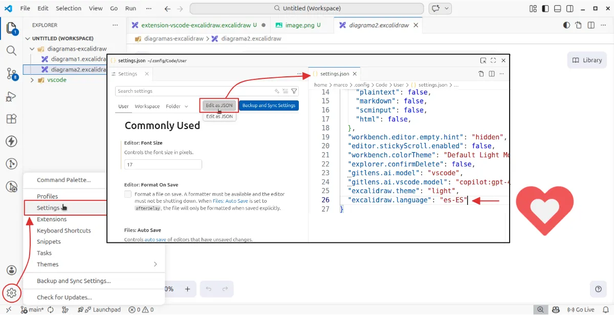 De forma predeterminada, la extensión utiliza la configuración de VS Code, si el editor está en inglés la integración de Excalidraw se configura con ese idioma. Para cambiar el idioma, abrimos nuevamente el archivo settings.json y definir el código regional en excalidrar.languaje. Por ejemplo, cambiar el español: