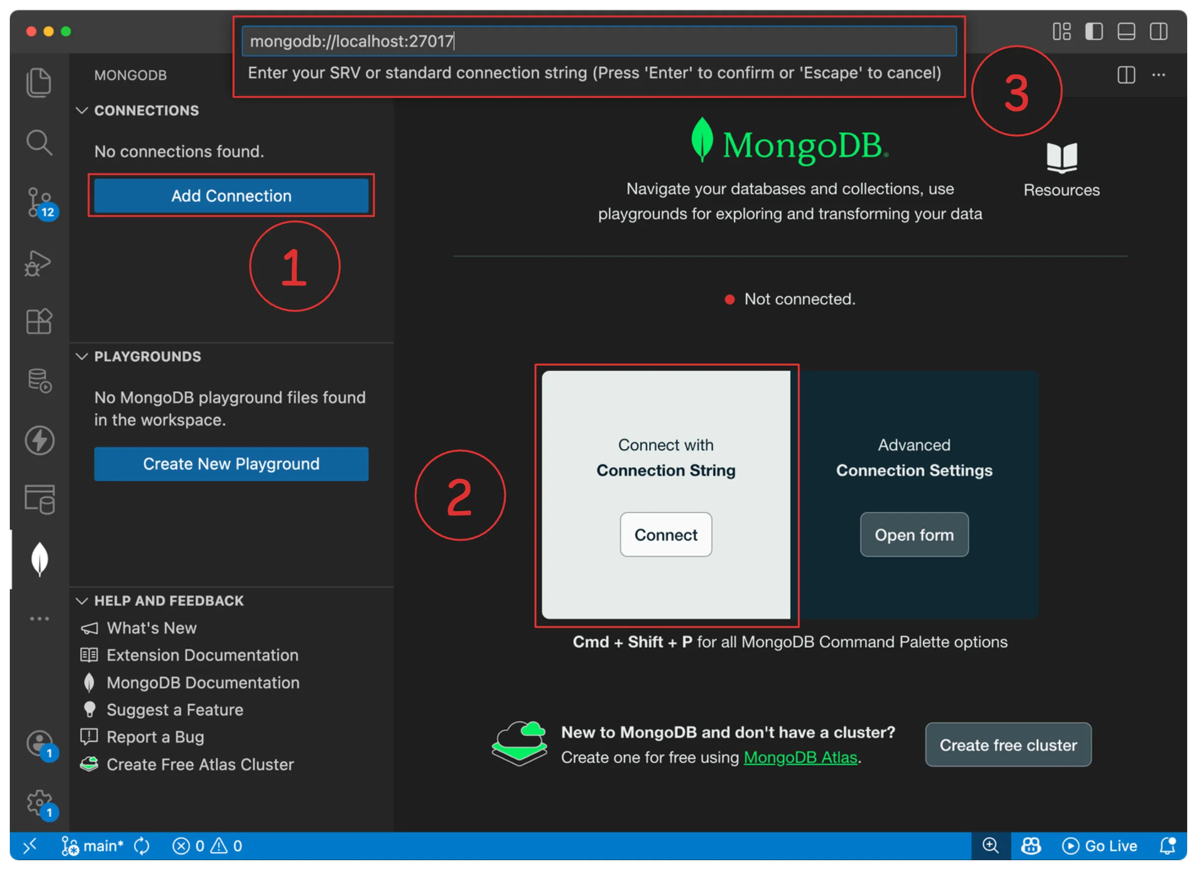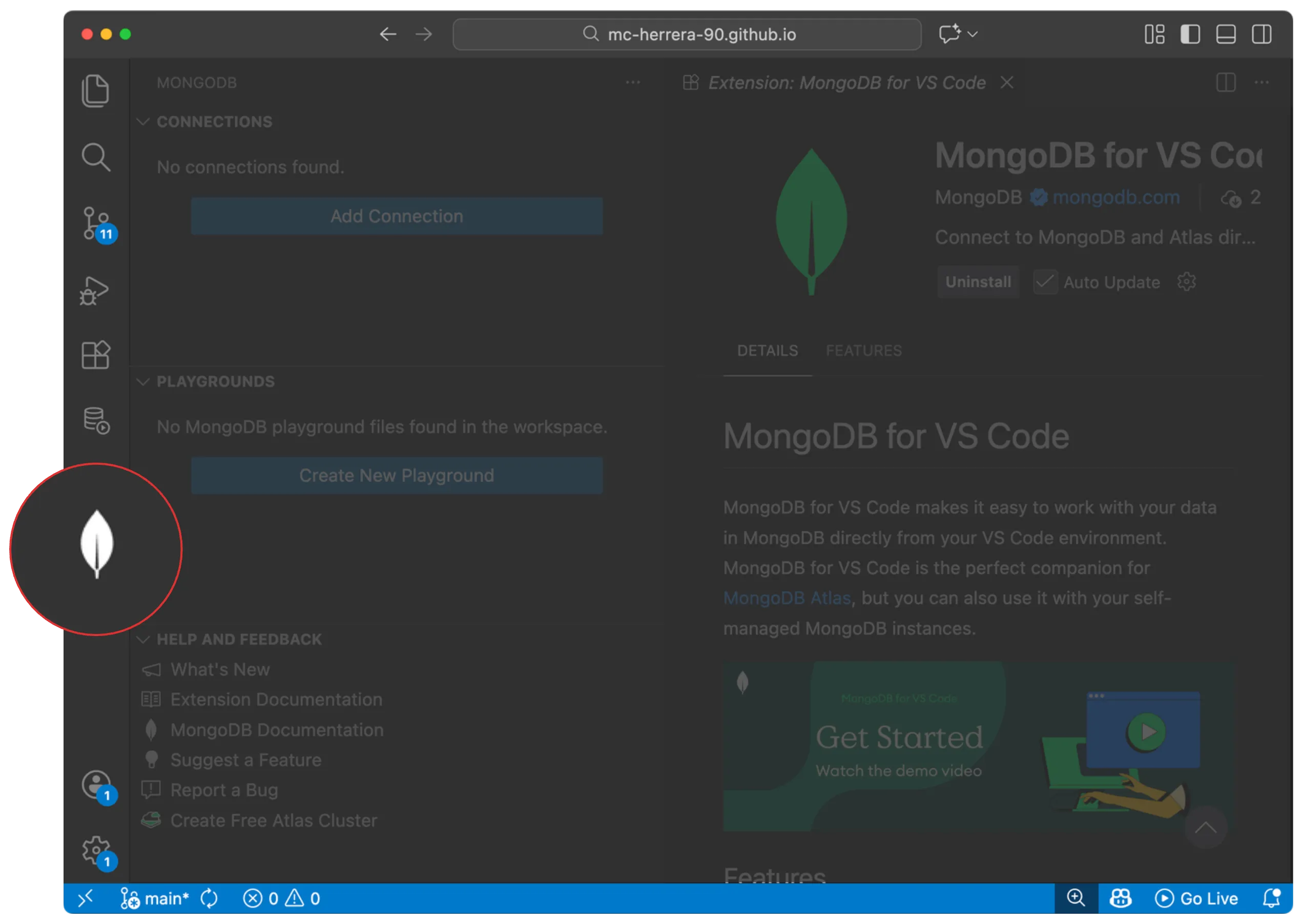 Para empezar a trabajar con una base de datos desde VS Code, debes conectar con un servidor primero. Instalada la extensión se nos habilitará una nueva sección en la barra lateral izquierda con el ícono de MongoDB.