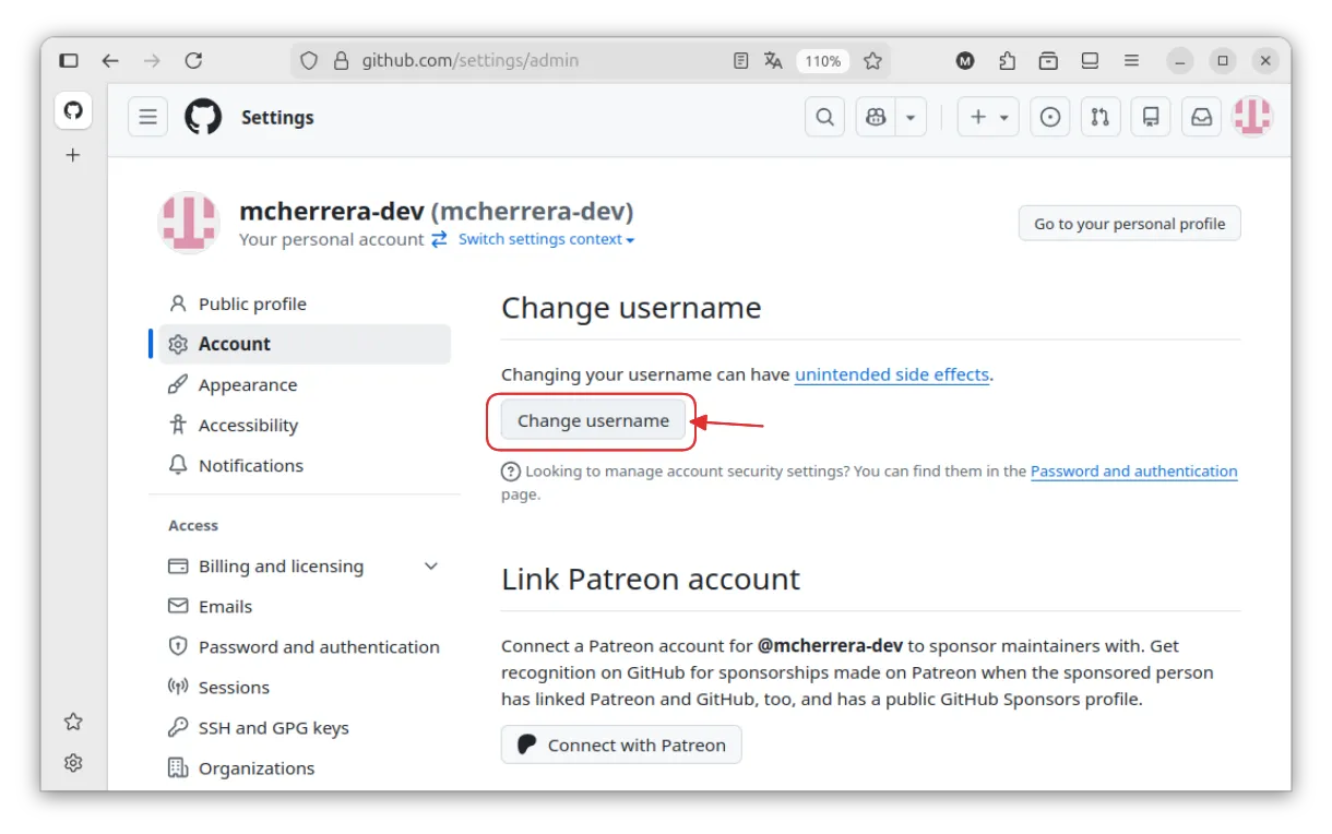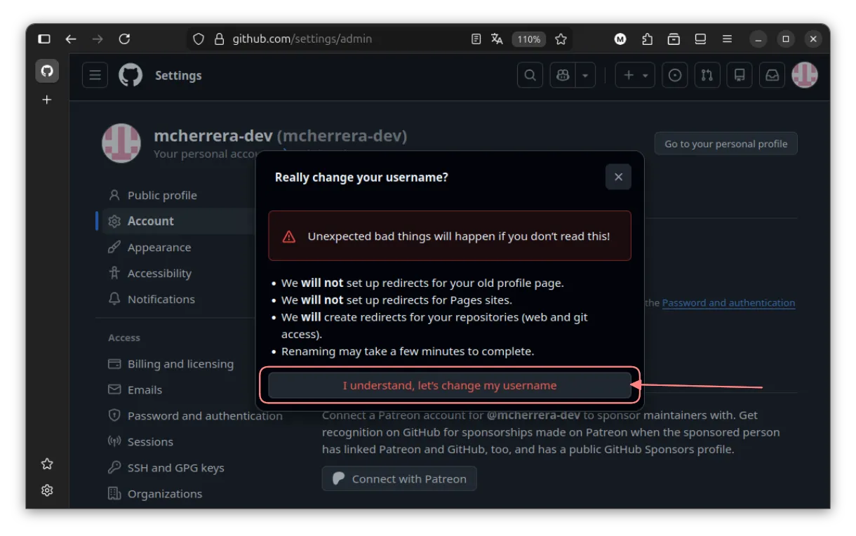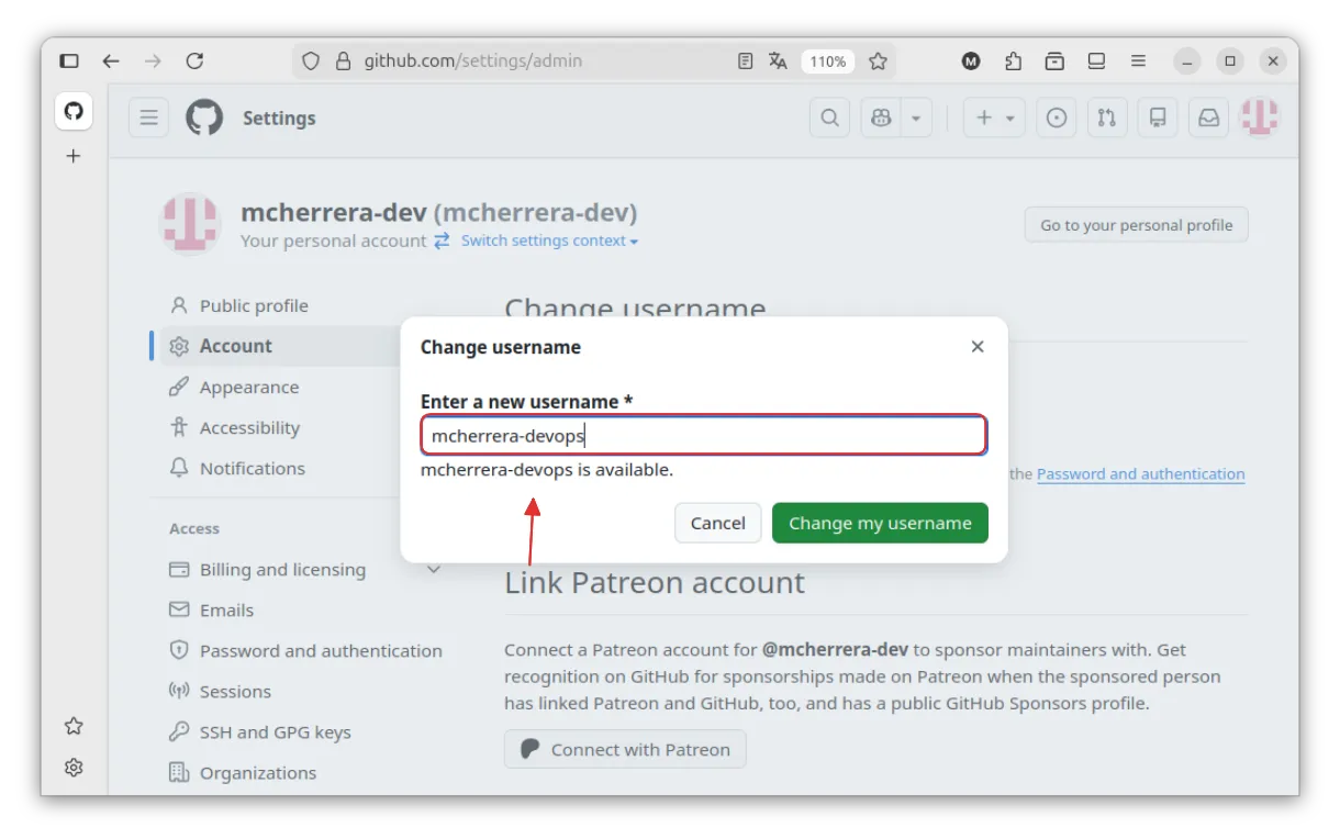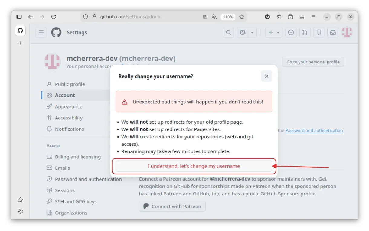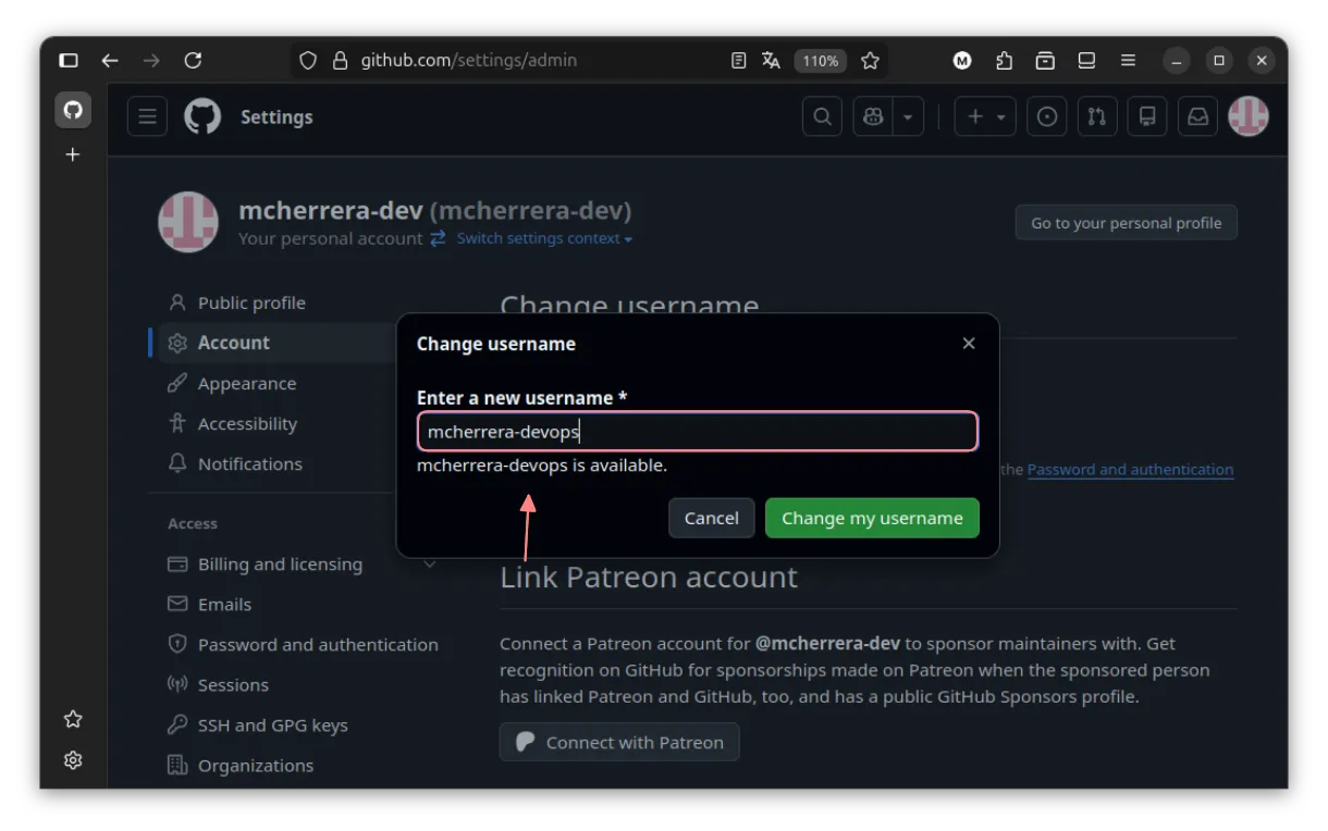 Cambiar el username en GitHub es un proceso simple, sigue las indicaciones: