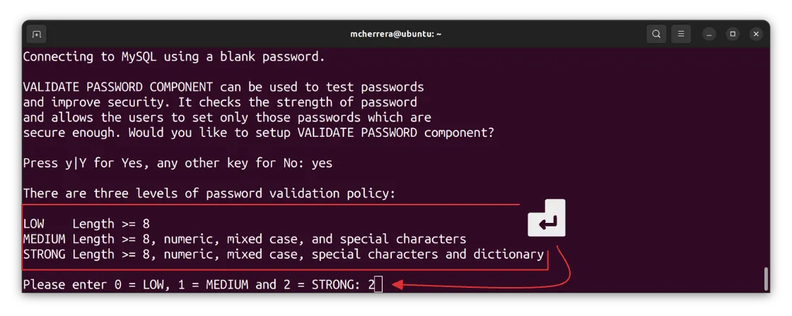 La primera pregunta nos solicitará si queremos validar la contraseña usada para conectarse al servidor, si lo deseamos al momento de crear un nuevo usuario en el sistema, MySQL nos validará si la contraseña cumple con las condiciones mínimas de seguridad.