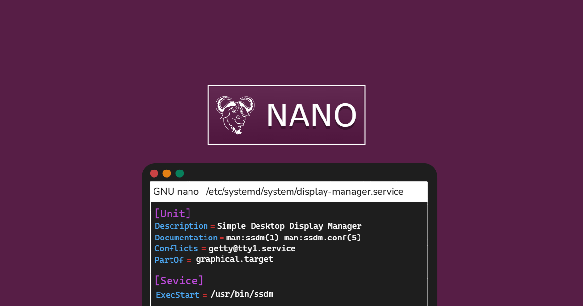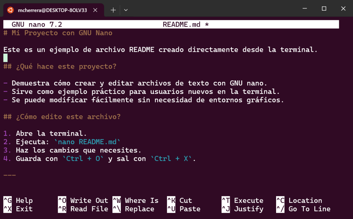 El editor Nano (oficialmente GNU nano) es un ligero editor de texto de línea de comandos muy amigable. Aunque a simple vista parece una herramienta básica, ofrece funciones muy útiles y es una excelente opción para editar archivos de configuración, crear scripts o lanzadores.