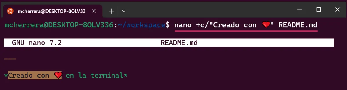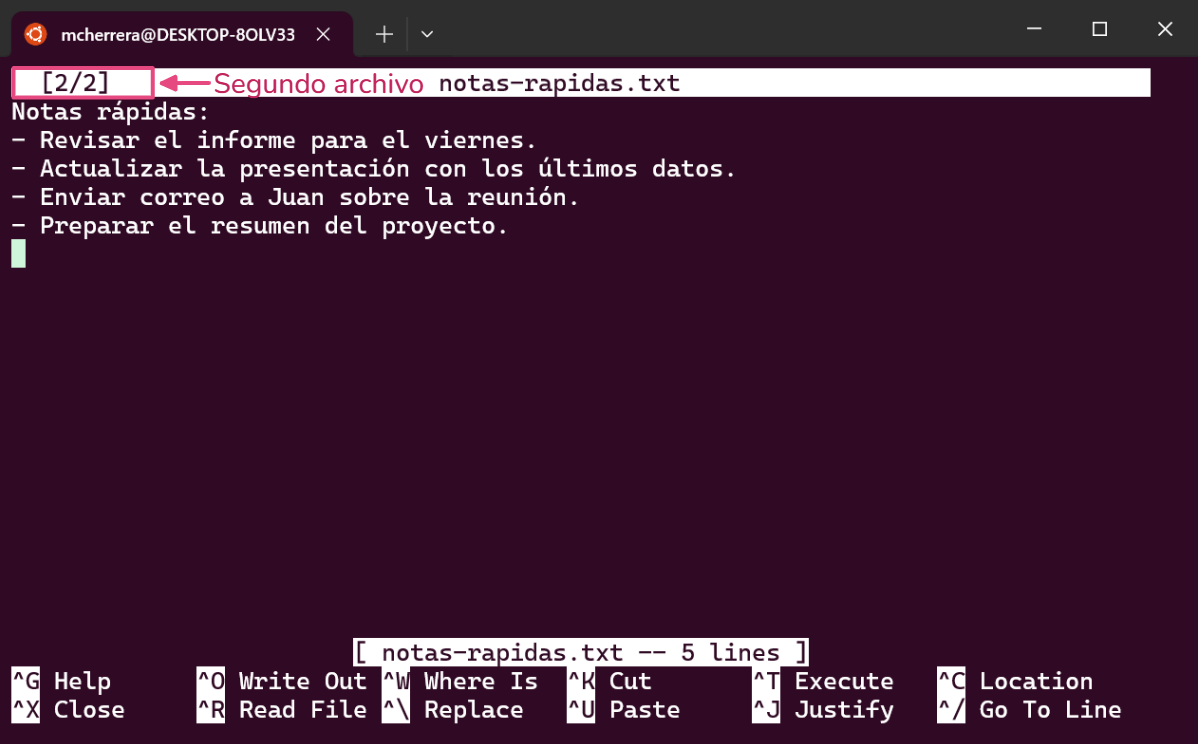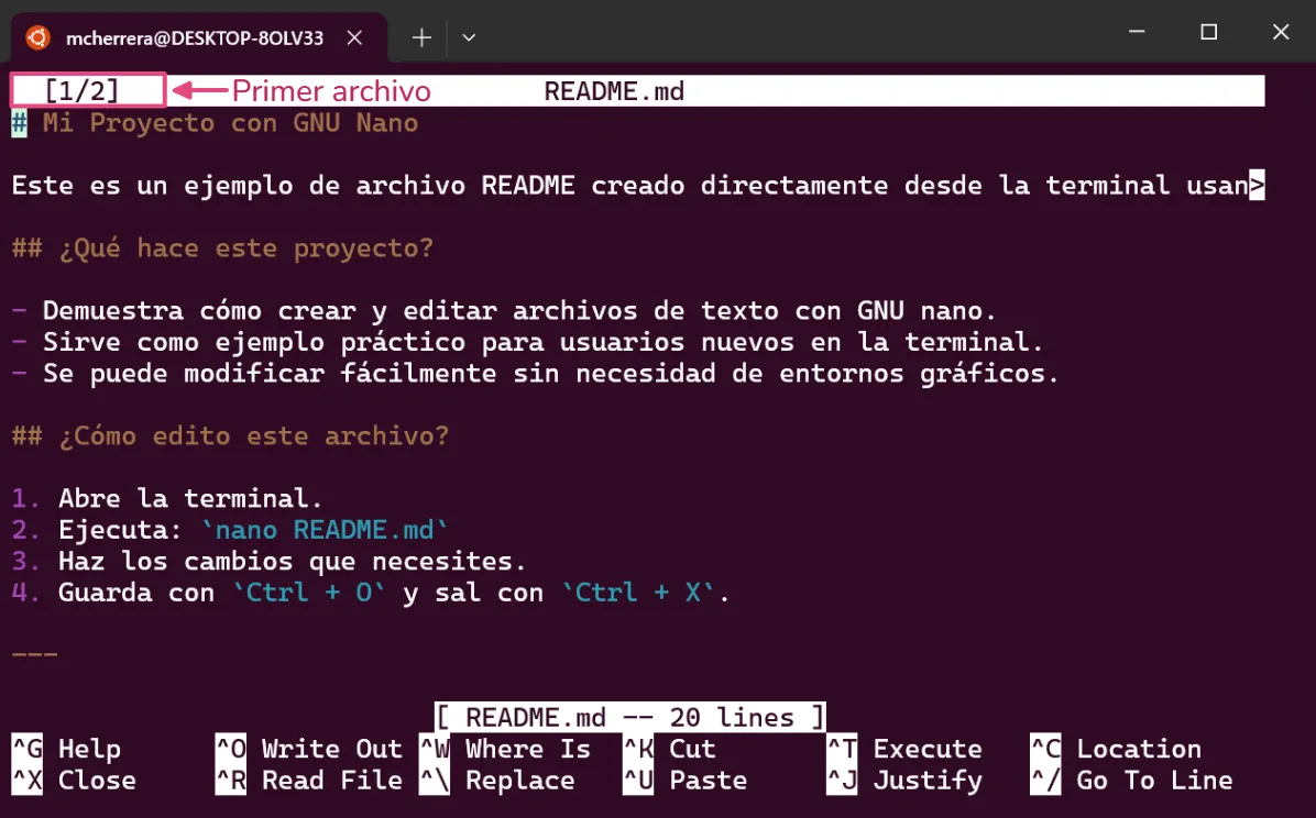 Nano también puede abrir archivos colocando el cursor en una línea o buscando una palabra específica, muy útil para editar archivos largos o navegar rápidamente a una sección del archivo.