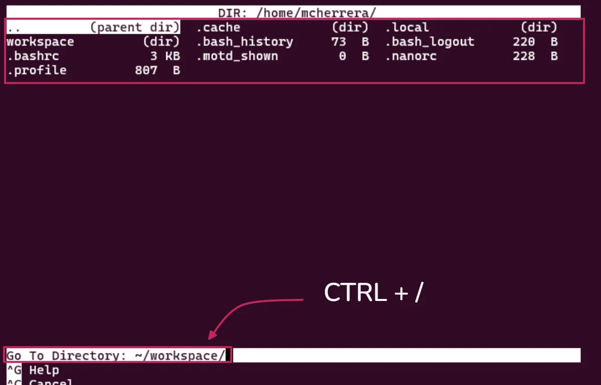 En ese modo, también es posible presionar Ctrl+/ para escribir un patrón de búsqueda o cambiar de directorio fácilmente: