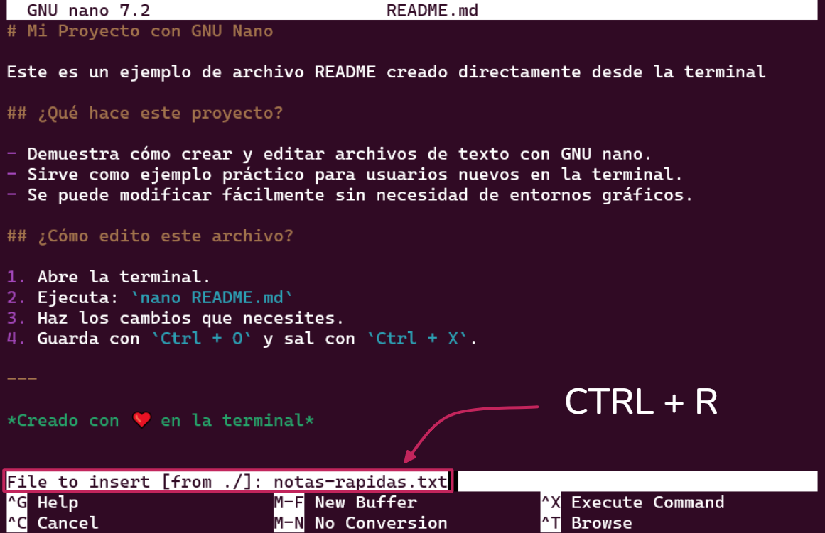 Sin embargo, si quieres abrir un archivo estando dentro de Nano, puedes utilizar el atajo de teclado predeterminado (CTRL+R).