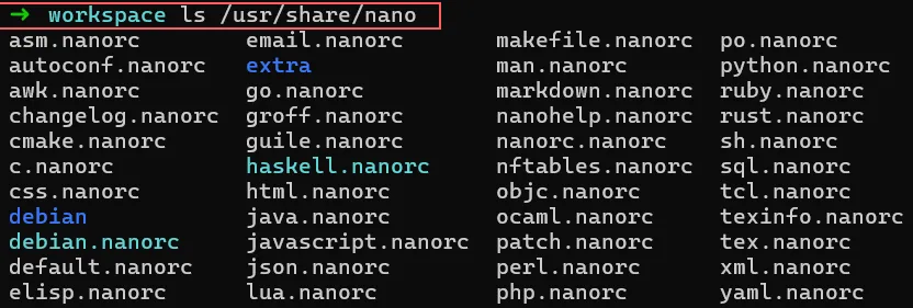 Nano contiene por defecto varios archivos de configuración, ubicados comúnmente en el directorio /usr/share/nano/