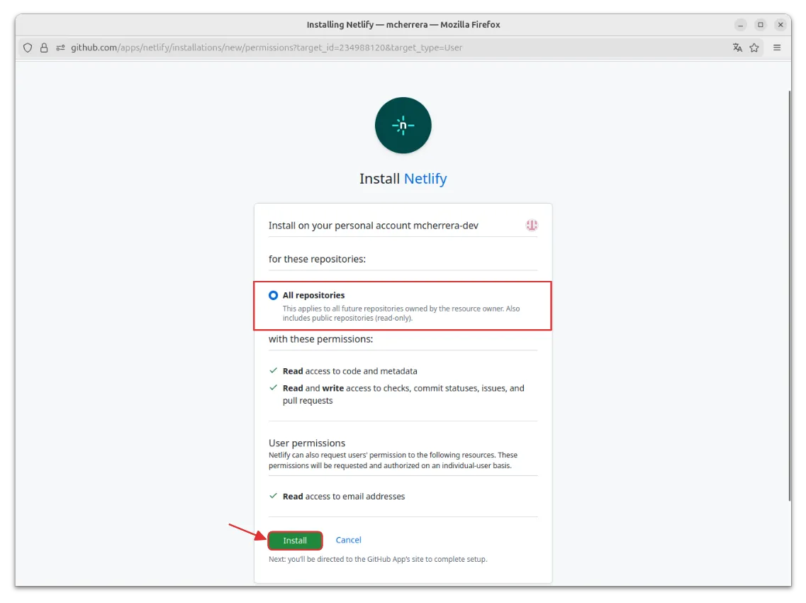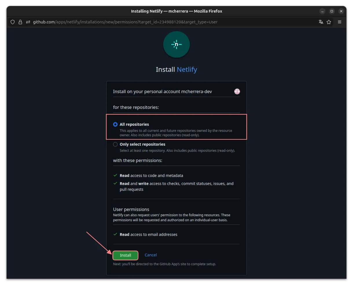 Esto sirve para que Netlify tenga acceso a todos tus repositorios, con permisos para leer el código y gestionar despliegues. Al hacer clic en Install, se concede el acceso y se completa la configuración.