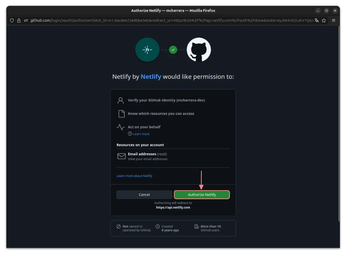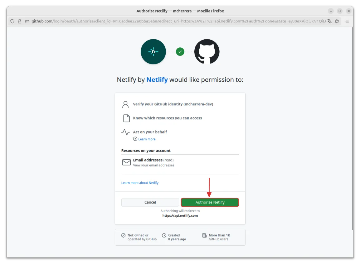 En la siguiente pantalla vamos a autorizar la instalación de Netlify en nuestra cuenta de GitHub.