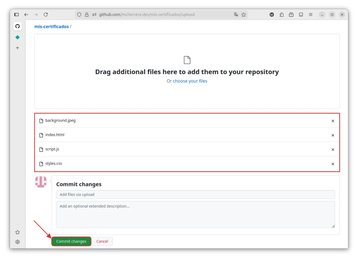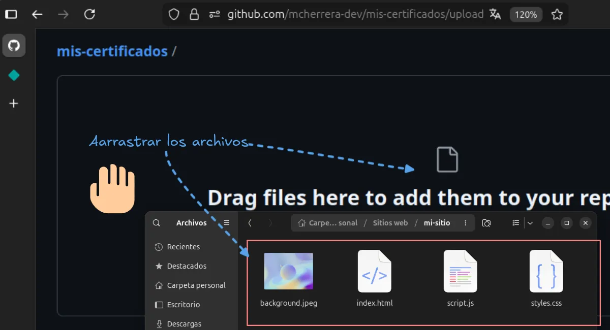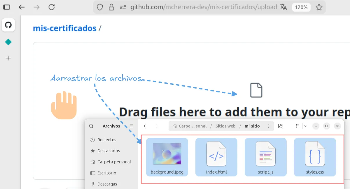 Ahora, subimos los archivos arrastrándolos al cuadro de carga para completar el proceso.