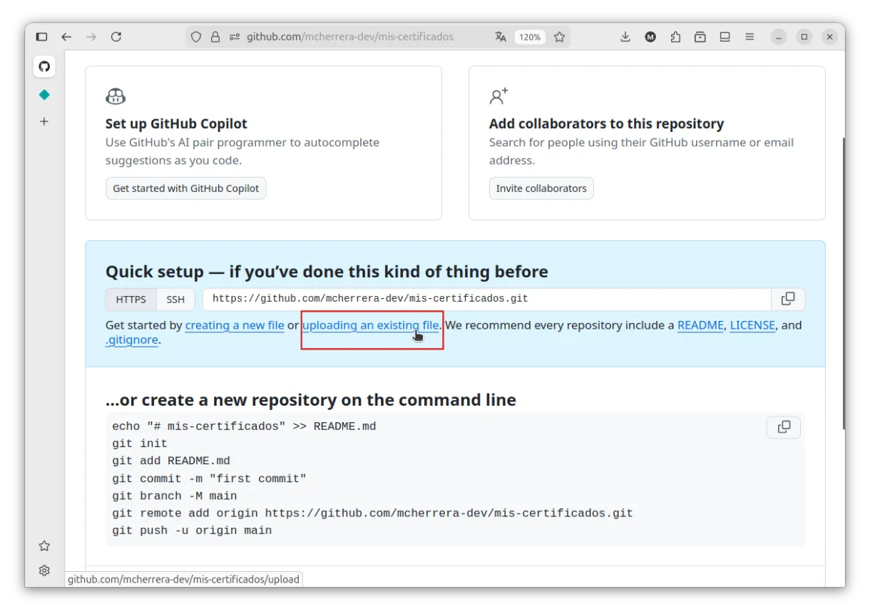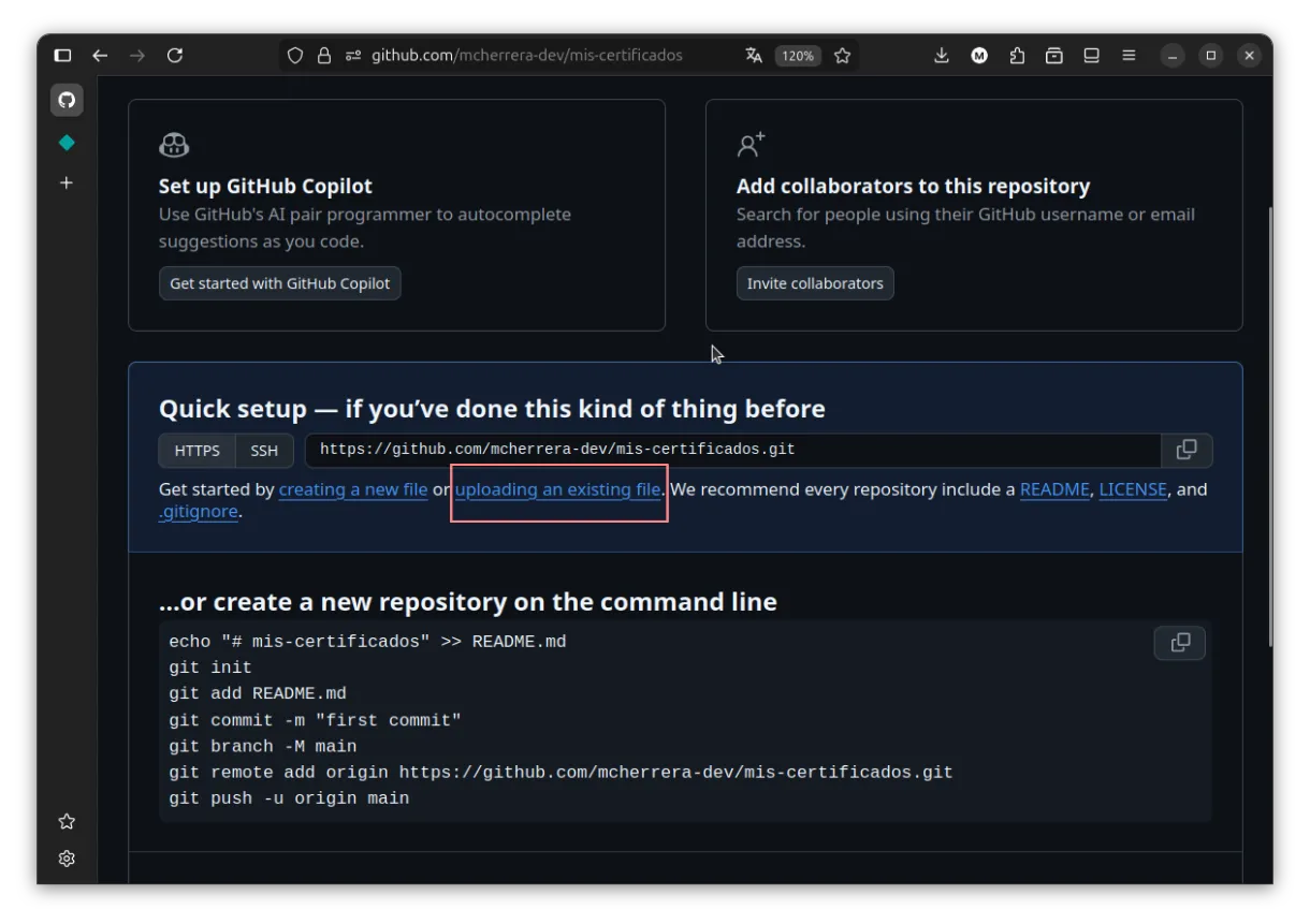 Una vez creado el repositorio, en la pantalla de configuración, realizaremos la subida mediante la carga de archivos.