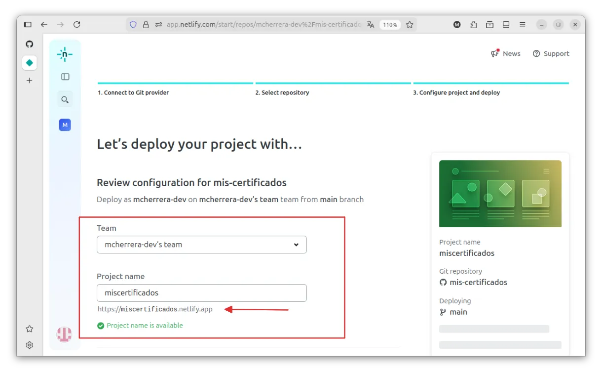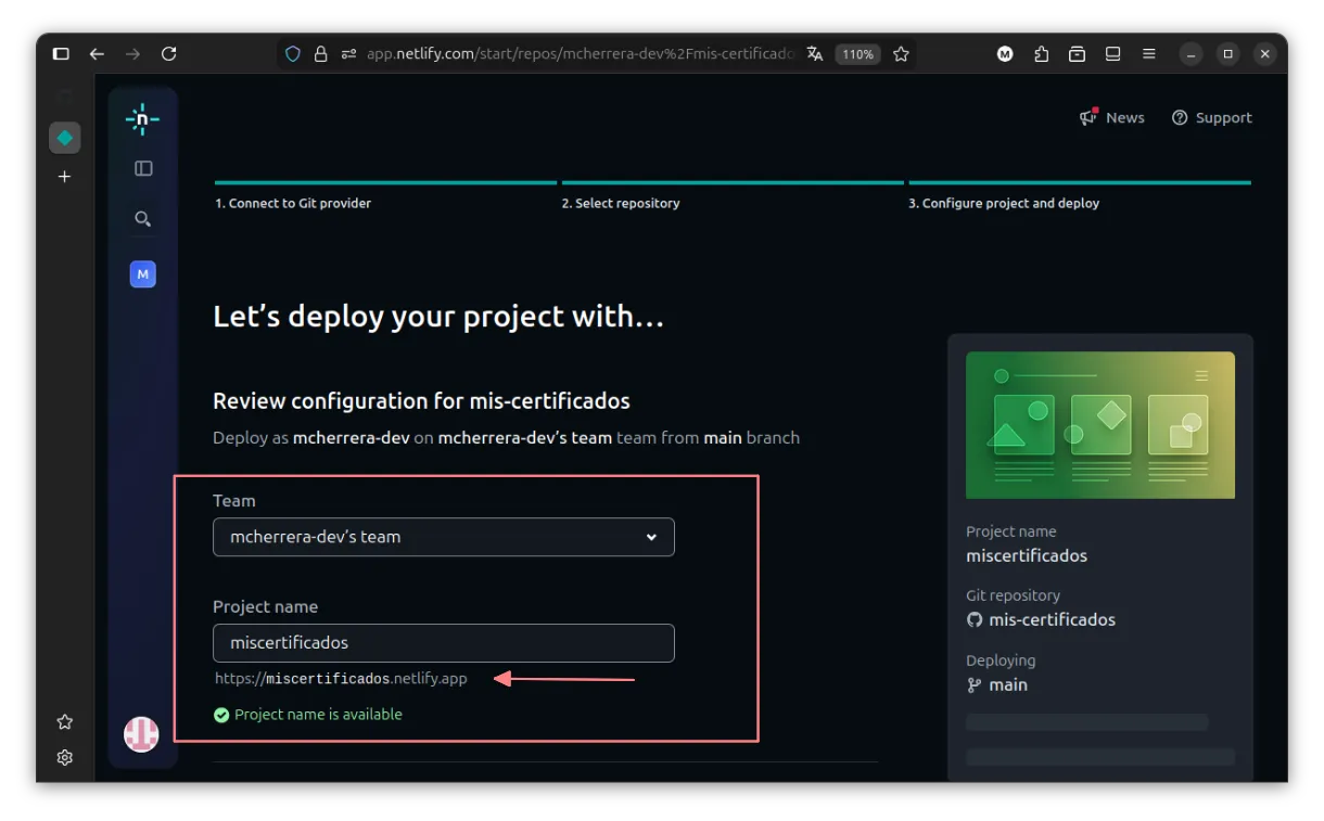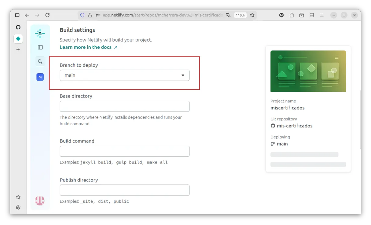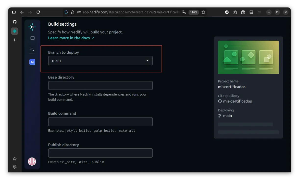 Si bajamos un poco, veremos la opción para elegir la rama que Netlify va a observar. Cada vez que haya cambios en ella, se lanzará un nuevo proceso de build. En nuestro caso, Netlify ya detecta la rama main, así que no es necesario modificar nada.