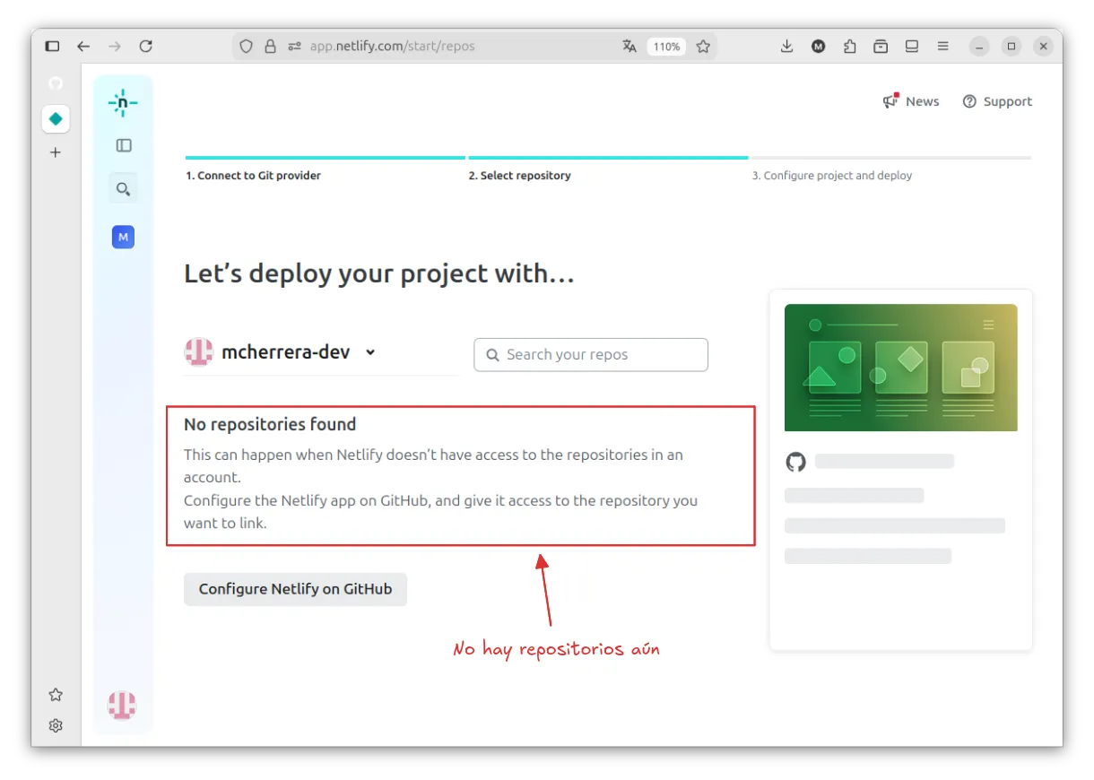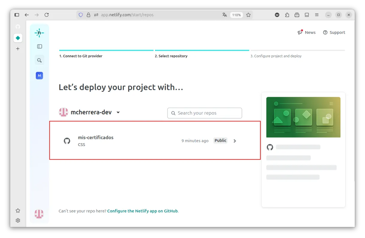 Después de volver a la pantalla de Netlify, se mostrarán los repositorios.