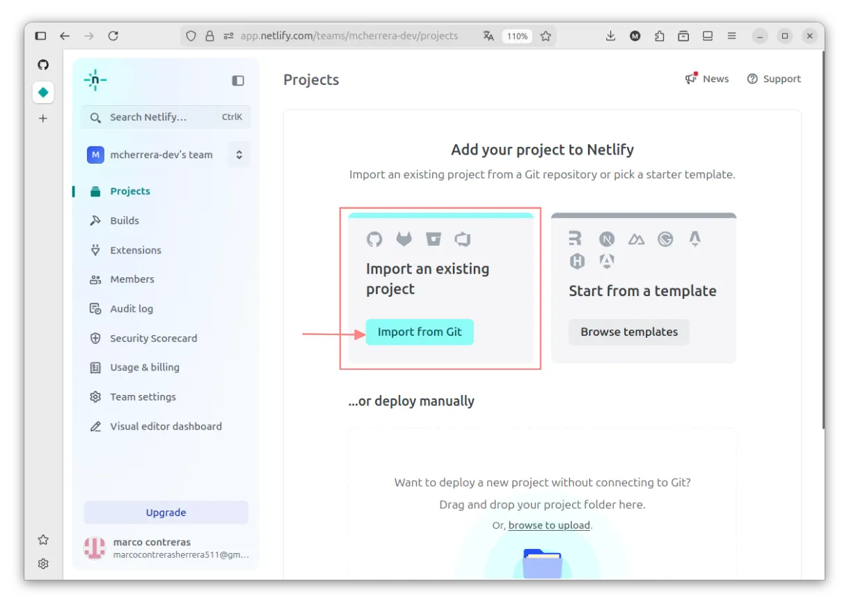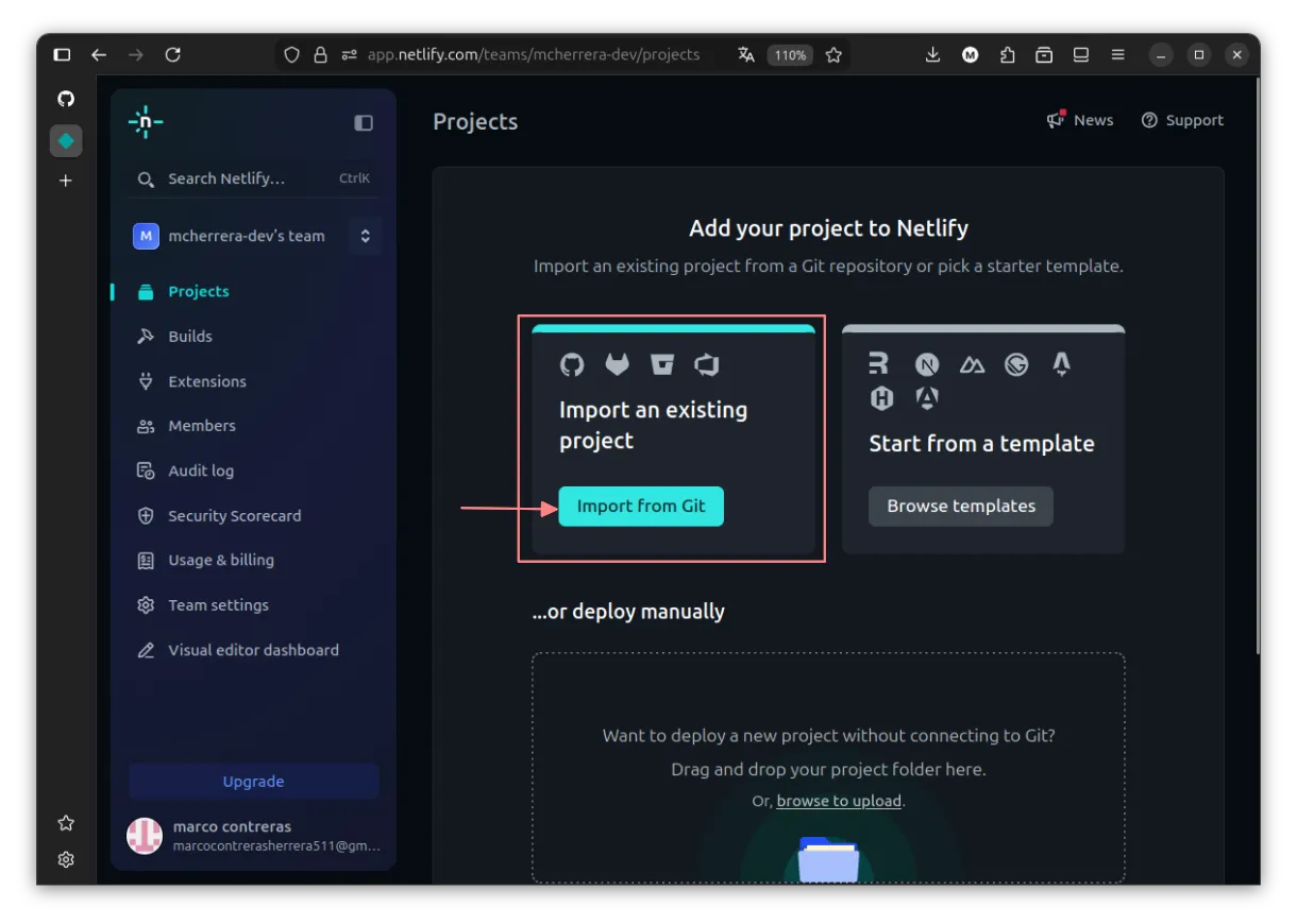 En el dashboard de Netlify, seleccionamos import from git.