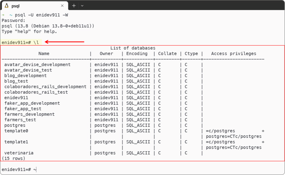 You are connected to database "enidev911" via socket as user "enidev911" via socket in "/var/run/postgresql" at port "5432".