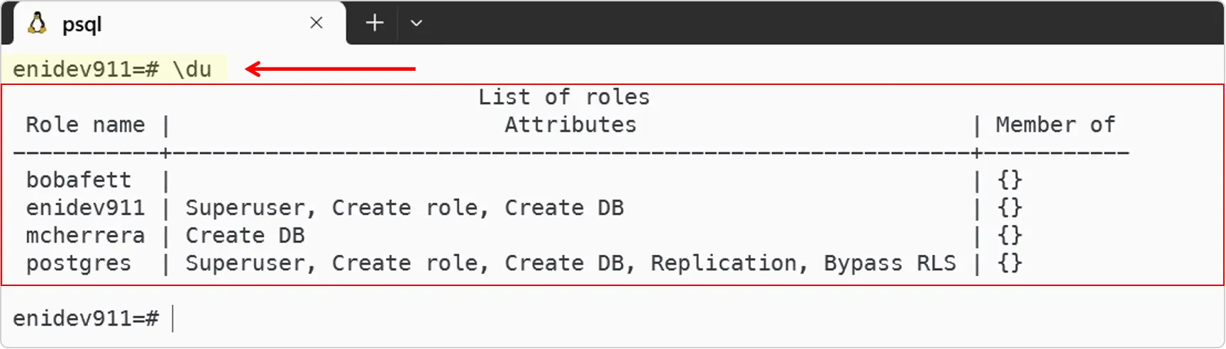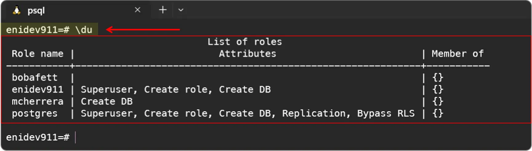 El metacomando \du se utiliza para mostrar la lista de todos los roles (usuarios y grupos) existentes en el servidor de PostgreSQL: