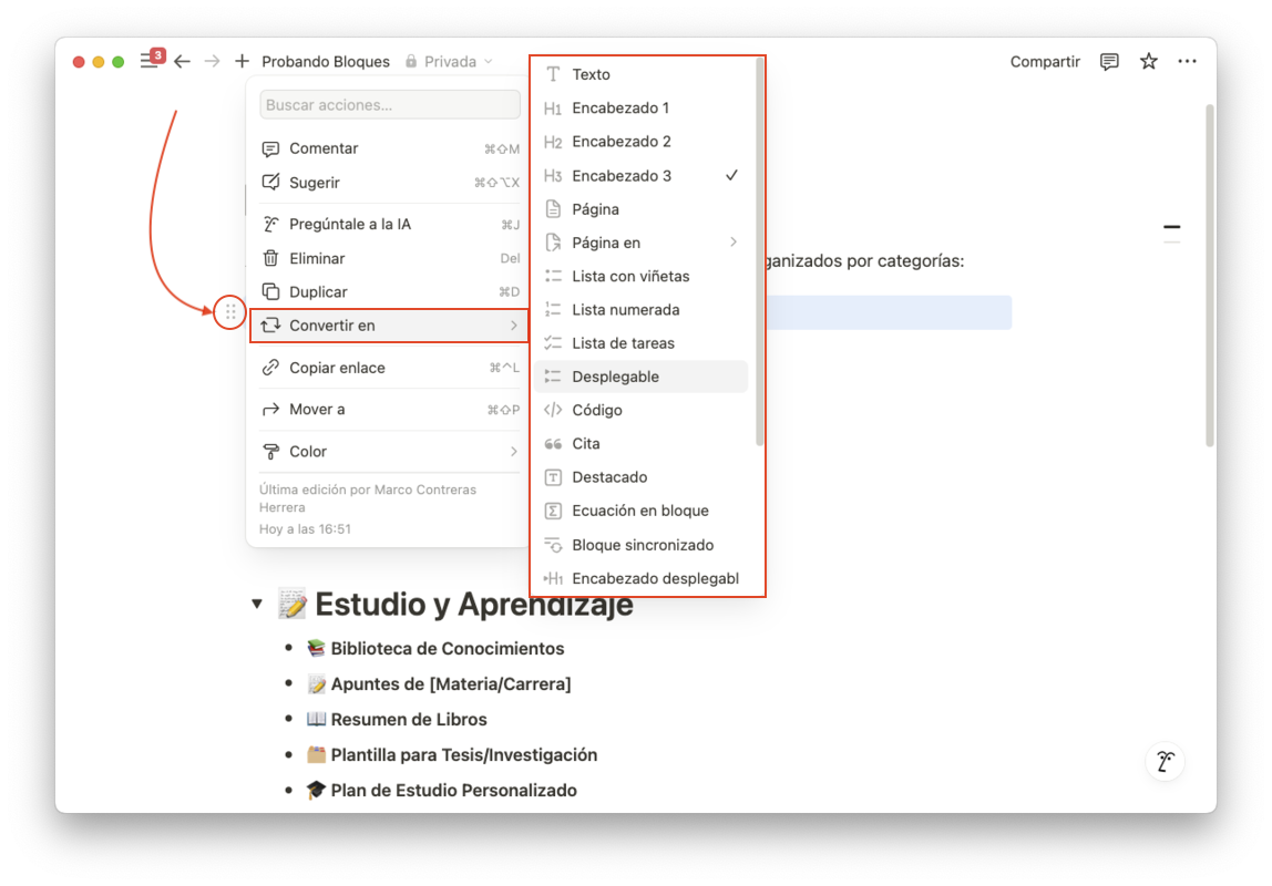 En Notion, todos los bloques se pueden convertir en bloques de otro tipo, para usar, ver o profundizar en esa misma información de una forma distinta: