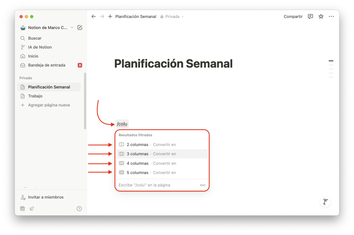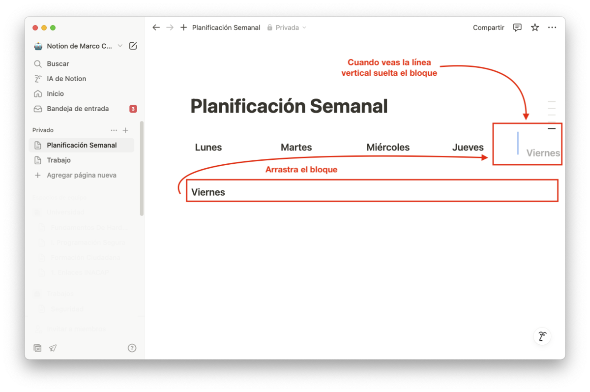 Aunque Notion no tiene un botón directo para crear columnas, podemos hacerlo de forma muy sencilla con arrastrar y soltar: