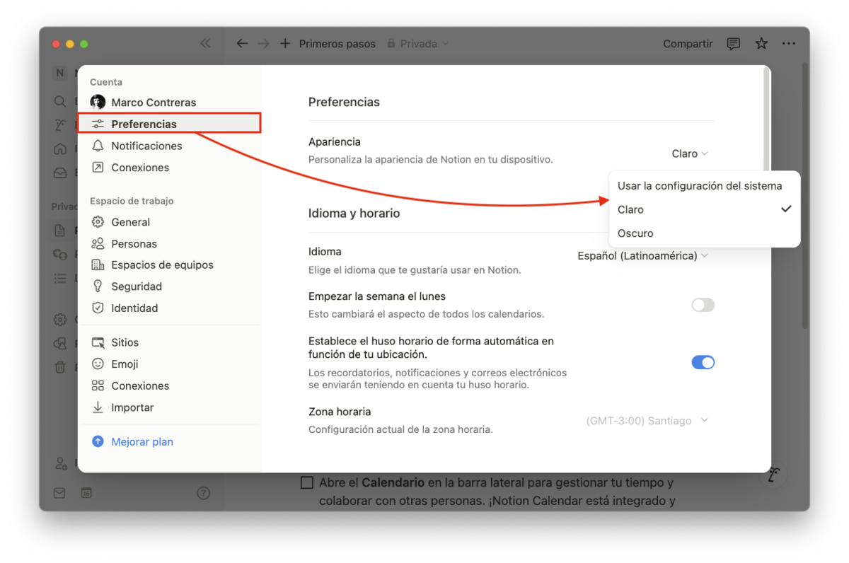 Desde las configuraciones, puedes ajustar las preferencias como idioma, temas, notificaciones, personalizar espacios de trabajos y permisos, etc.