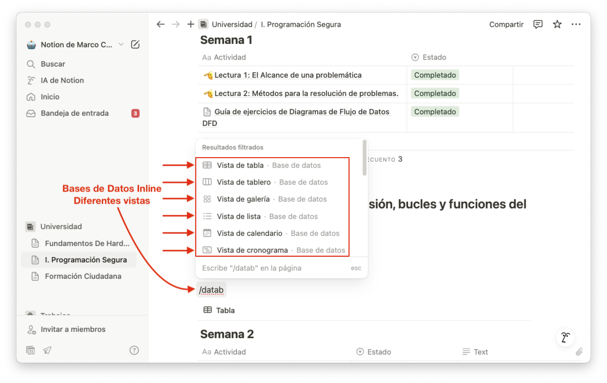 - Bases de Datos Inline (Dentro de una Página): Se insertan dentro de una página existente y se combinan con otros bloques de contenido, incluso otras bases de datos.