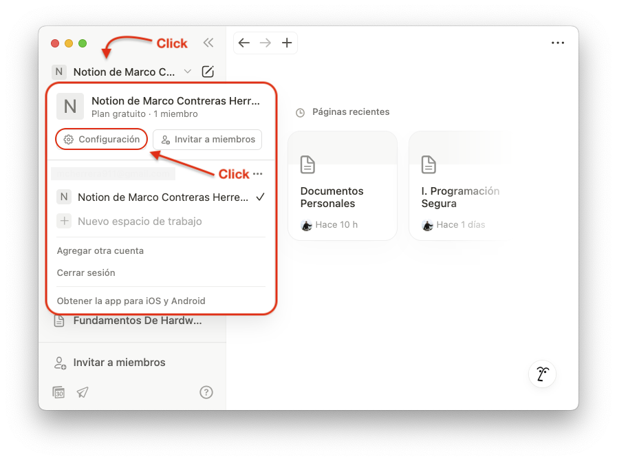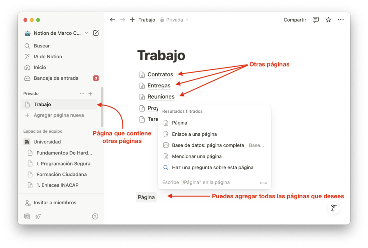 Las páginas en Notion son el contenedor principal de información. Puedes pensar en las páginas como documentos en blanco donde agregas contenido, pero también funcionan como carpetas porque pueden contener otras páginas dentro. Por ejemplo, si tienes una página llamada “Trabajo”, dentro de ella podrías tener otras páginas: