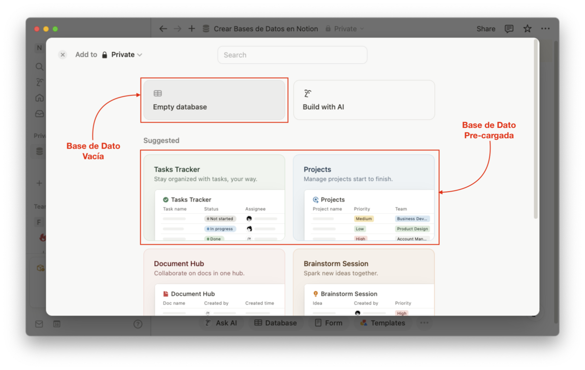 Al crear una base de datos full-page (creando una nueva página), puedes empezar desde cero o elegir entre las plantillas sugeridas: