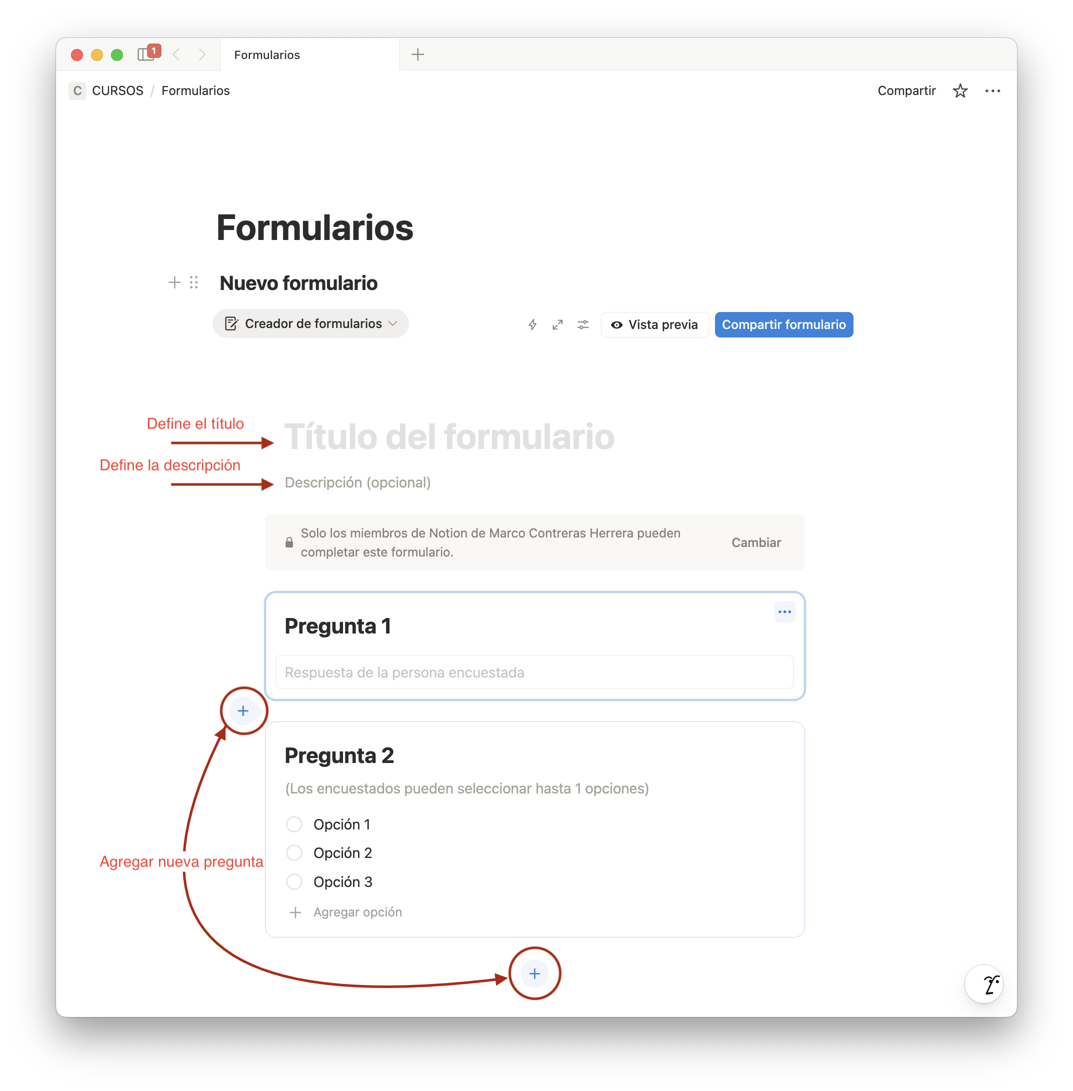 Desde 2024, Notion permite formularios públicos, es decir, cualquier persona con el enlace puede completarlos, aunque no tenga cuenta de Notion siempre que el formulario esté configurado como “público” mediante la opción “Compartir en la web”.