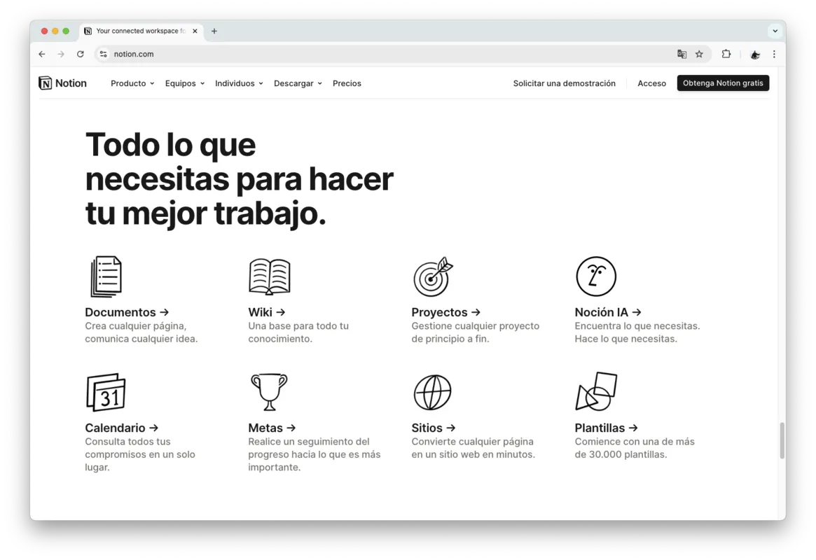 Notion es una de las herramientas de productividad de más rápido crecimiento en los últimos tiempos. Su versatibilidad y capacidad para adaptarse a diferentes flujos de trabajo han hecho que muchos usuarios avanzados se enamoren de esta herramienta. Aunque en los últimos años ha enfrentado ciertas limitaciones derivadas de cambios en su modelo de negocio (restricciones en algunas funciones que antes eran gratuitas), sigue siendo una opción muy sólida para organizar información y proyectos.
