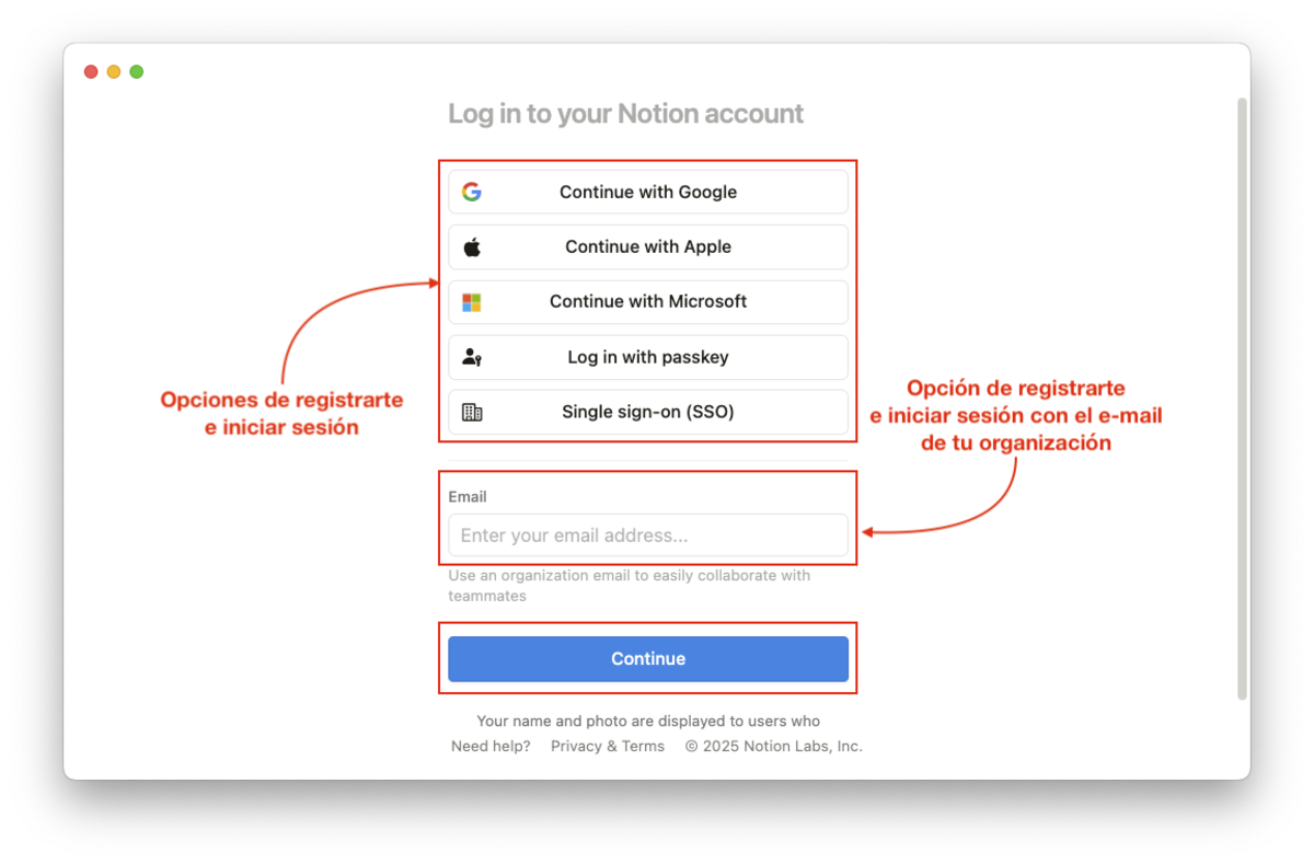 Lo primero que se debe hacer es crear una cuenta. Para esto, se debe ingresar a la página de registro Notion. Una vez allí, selecciona la opción con la cual te quieres registrar.