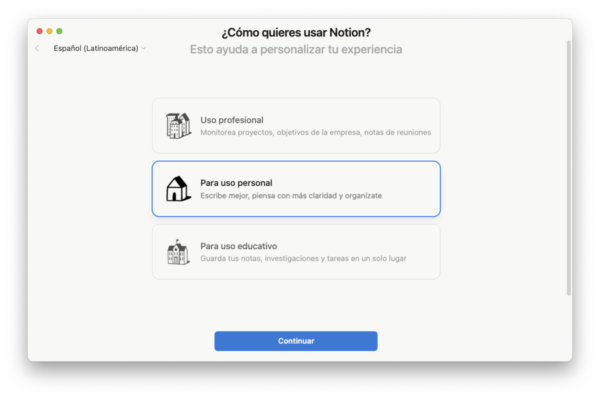 Una vez creamos una cuenta para usar Notion, la primera vez que iniciamos sesión en Notion nos va a ayudar a configurar un espacio de trabajo. Para ello debes seleccionar las opciones que más se adaptan a tus necesidades: