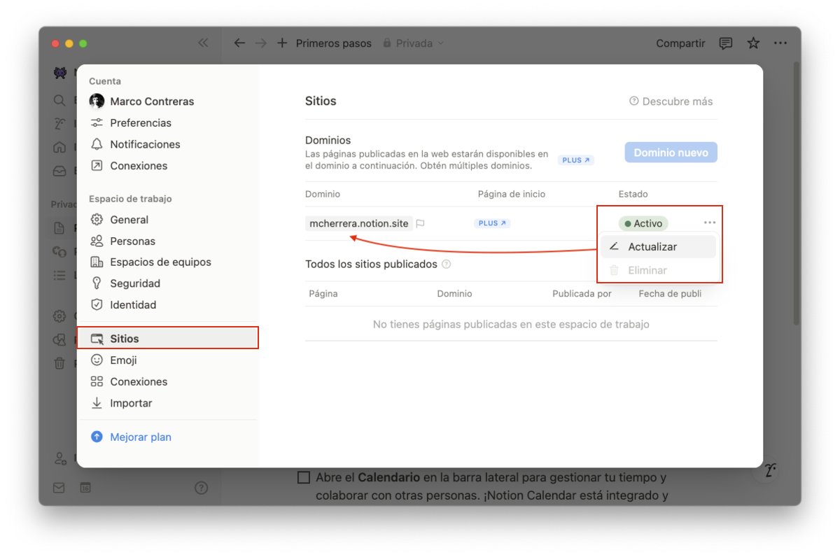 . Para ello debes entrar a configuraciones y en la opción Sitios actualiza el nombre de dominio: