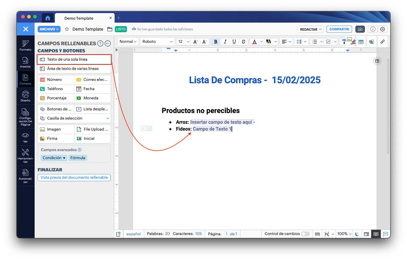 Para hacerlo, solo debes abrir el menu lateral y cambiar a la pestaña “Campos” y seleccionamos en este caso campos rellenables y eliges el de texto en una sola línea: