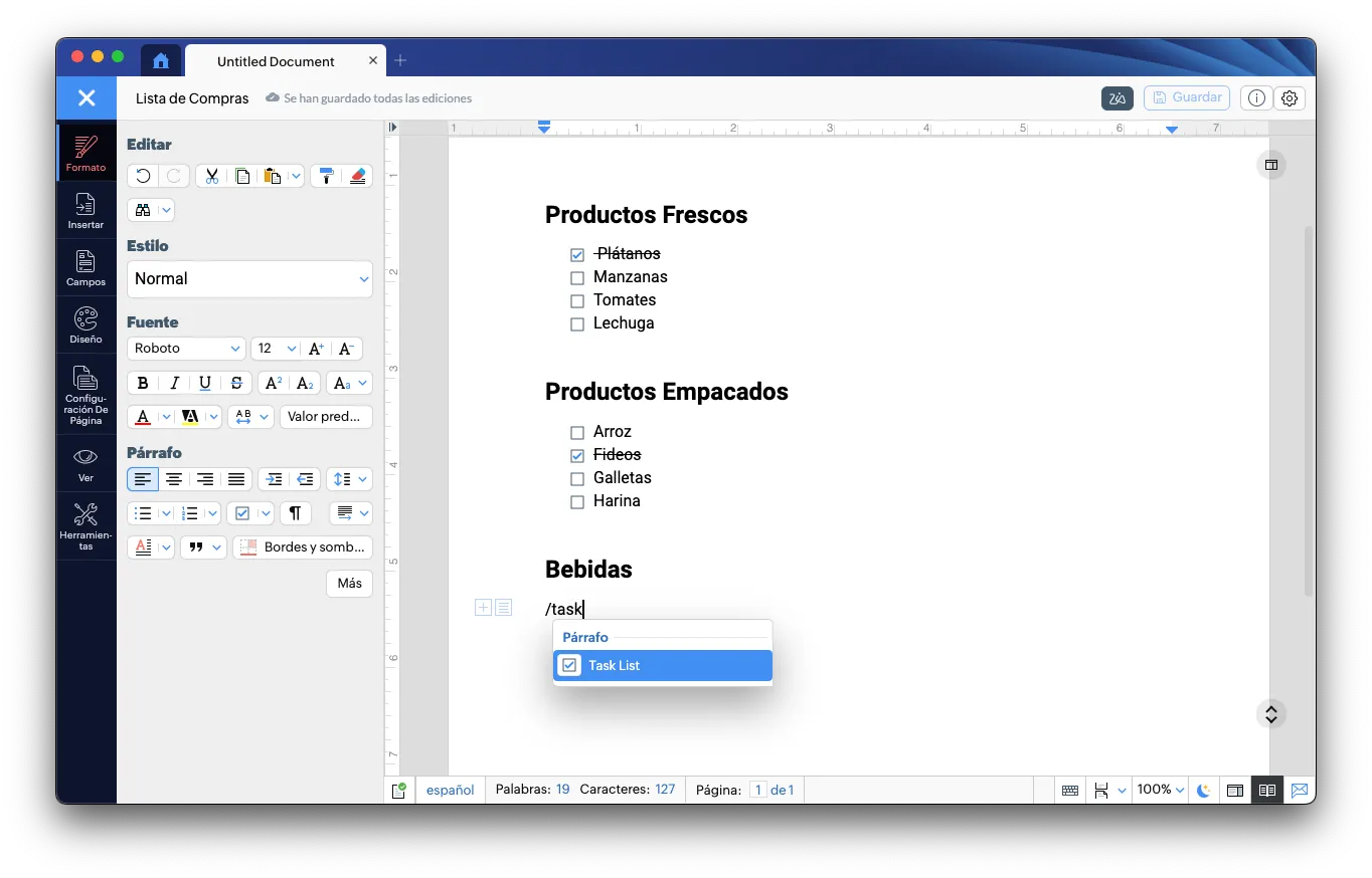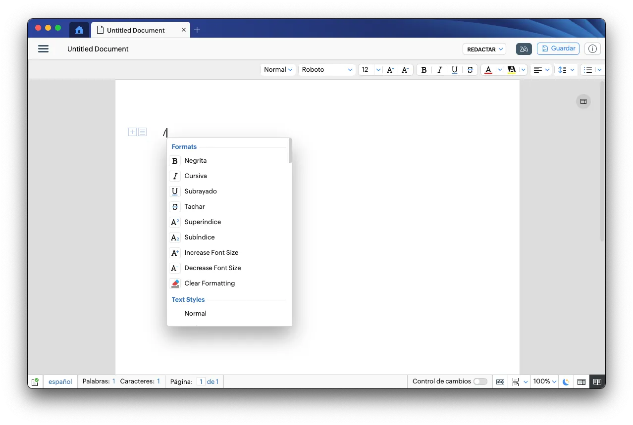 Una de las funcionalidades más comoda de Zoho Writer es la barra diagonal. Al escribir "/", se abre un menú donde puedes insertar rápidamente diferentes elementos en tu documento. Esto incluye: