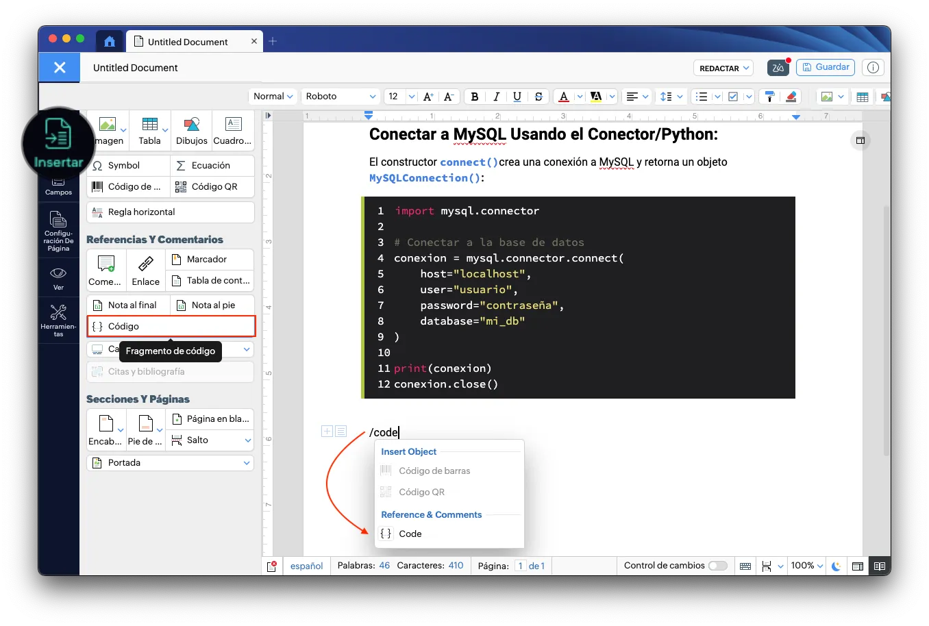 Para insertar un bloque de código,