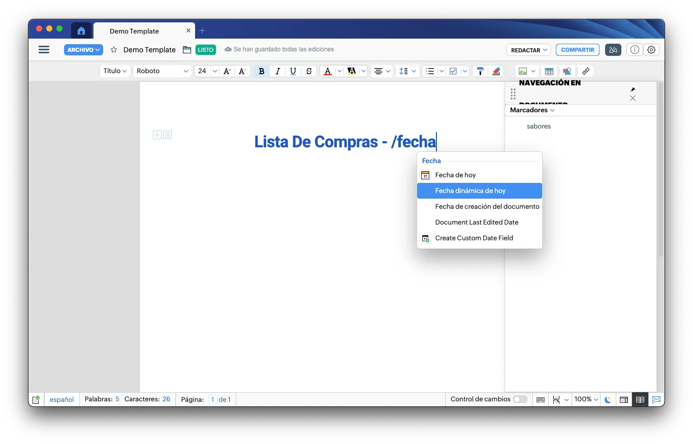 Comienza con un título claro y fácil de modificar. Usaremos una fecha dinámica de hoy para que siempre que se abra el documento muestre la fecha actual: