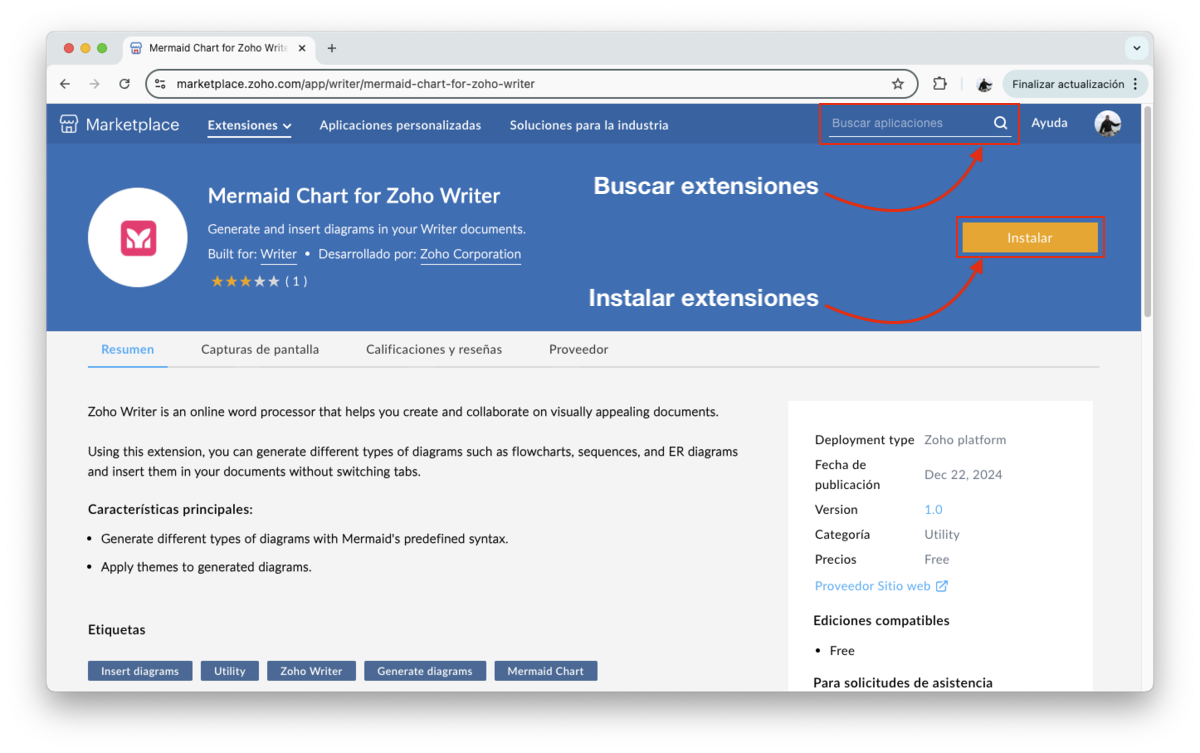 Para instalar una nueva extensión, puedes buscar en el marketplace de zoho y escribir el nombre de la extensión. Haz clic en Instalar y listo:
