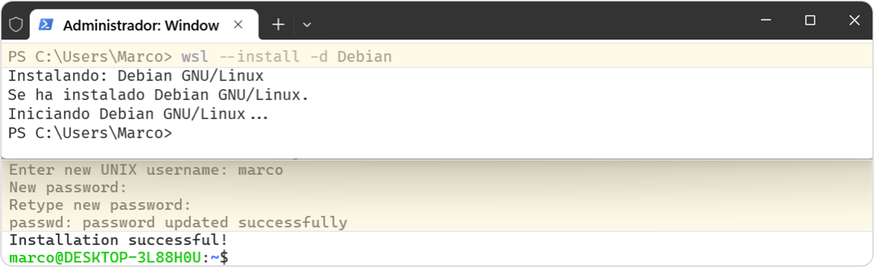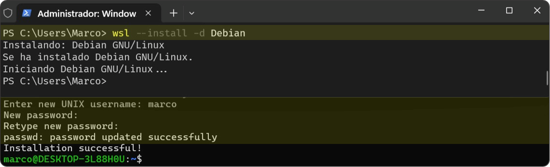 Cuando se termina de instalar la nueva distribución de WSL, se le pedirá que cree un nombre de usuario y una contraseña para la distribución de Linux: