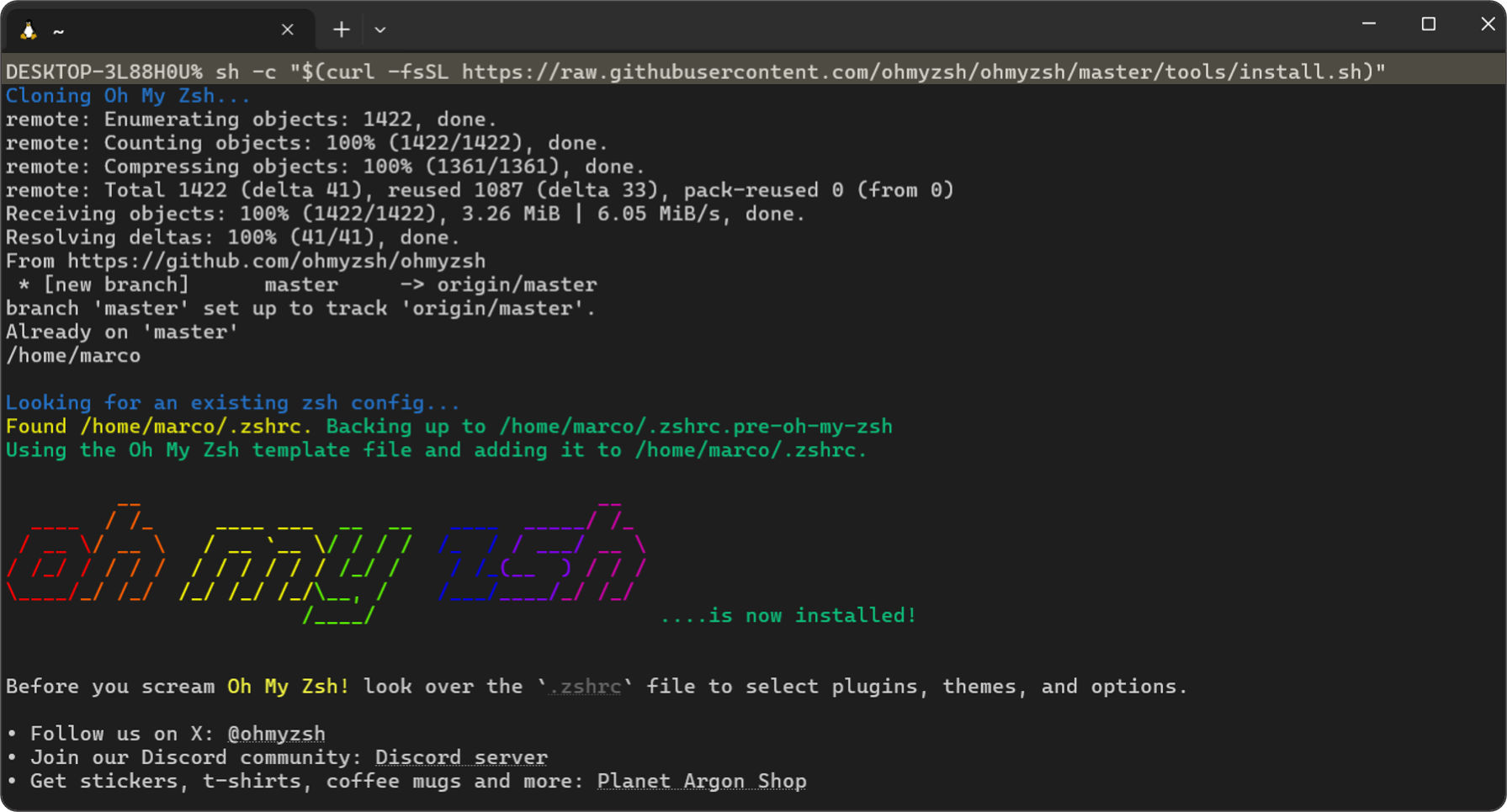 Este script instalará Oh My Zsh y cambiará tu configuración de Zsh automáticamente. A partir de aquí en adelante podemos personalizar la configuración editando el archivo ~/.zshrc